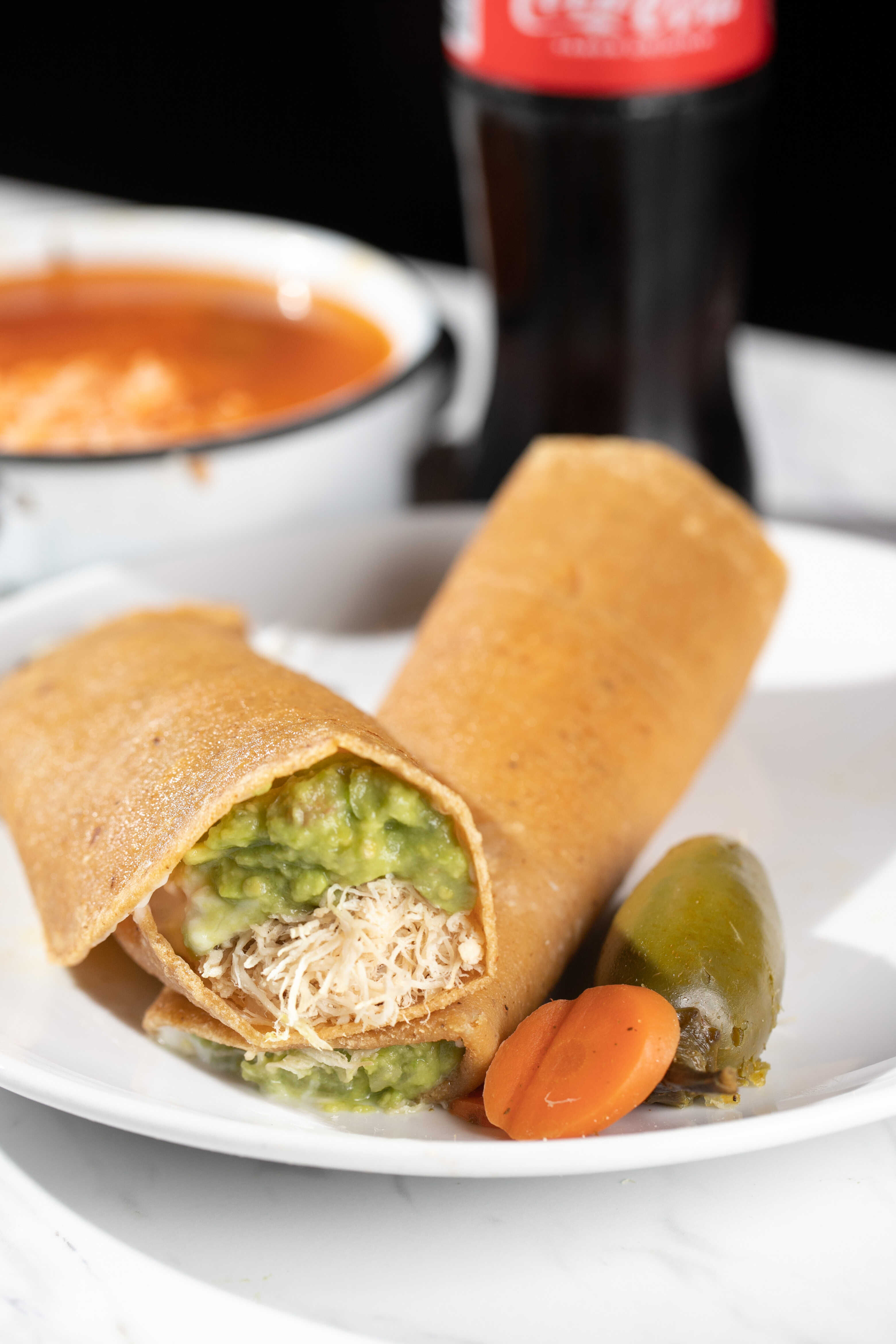 4 Deliciosos Tacos de Pollo con la Tortilla crujiente o suave al gusto, (Lechuga, Tomate, Crema y Aguacate) + 1 Complemento a elegir + 1 Refresco