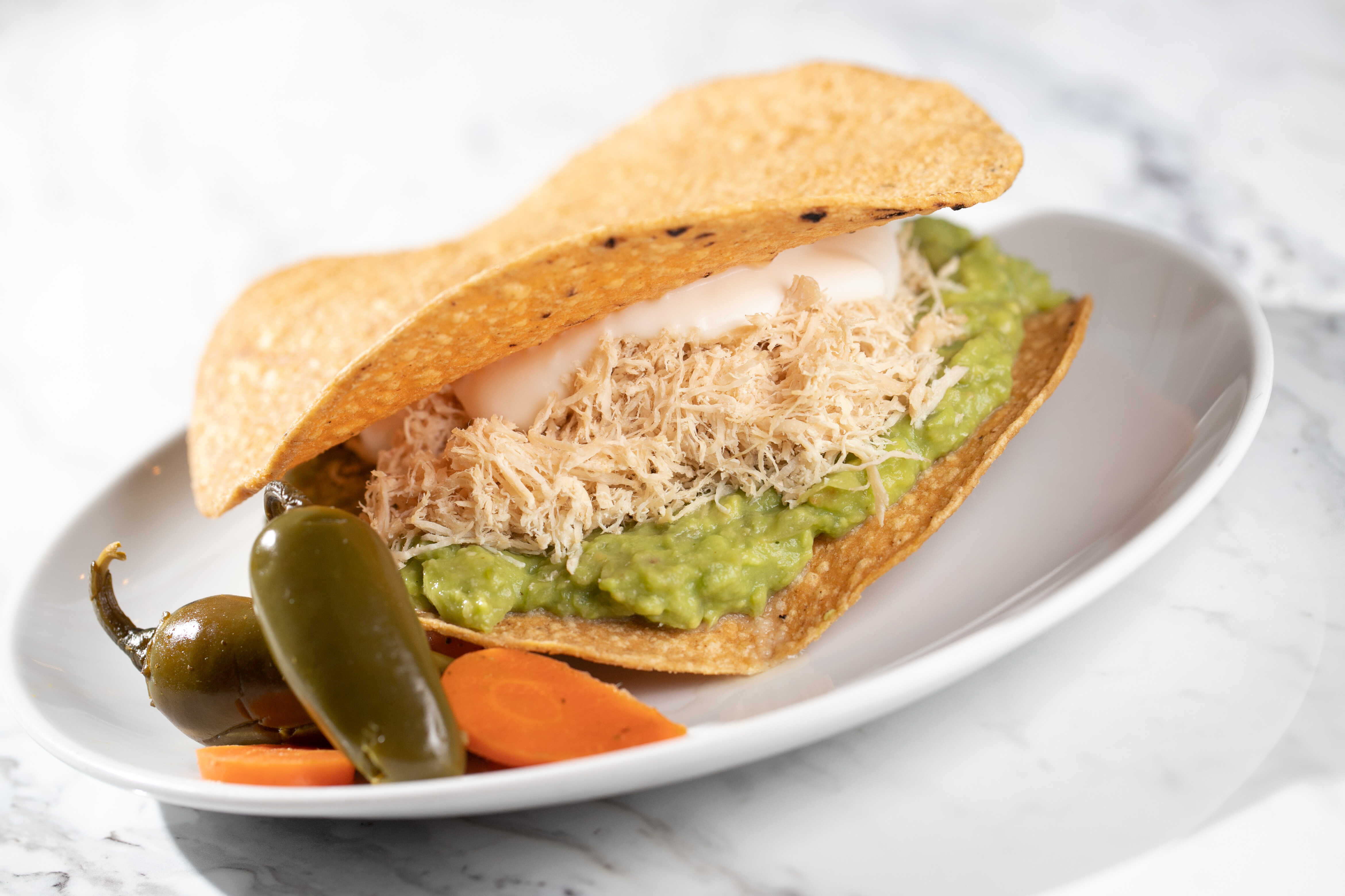 2 tostadas especiales con guacamole, pechuga de pollo desmenuzada y crema.