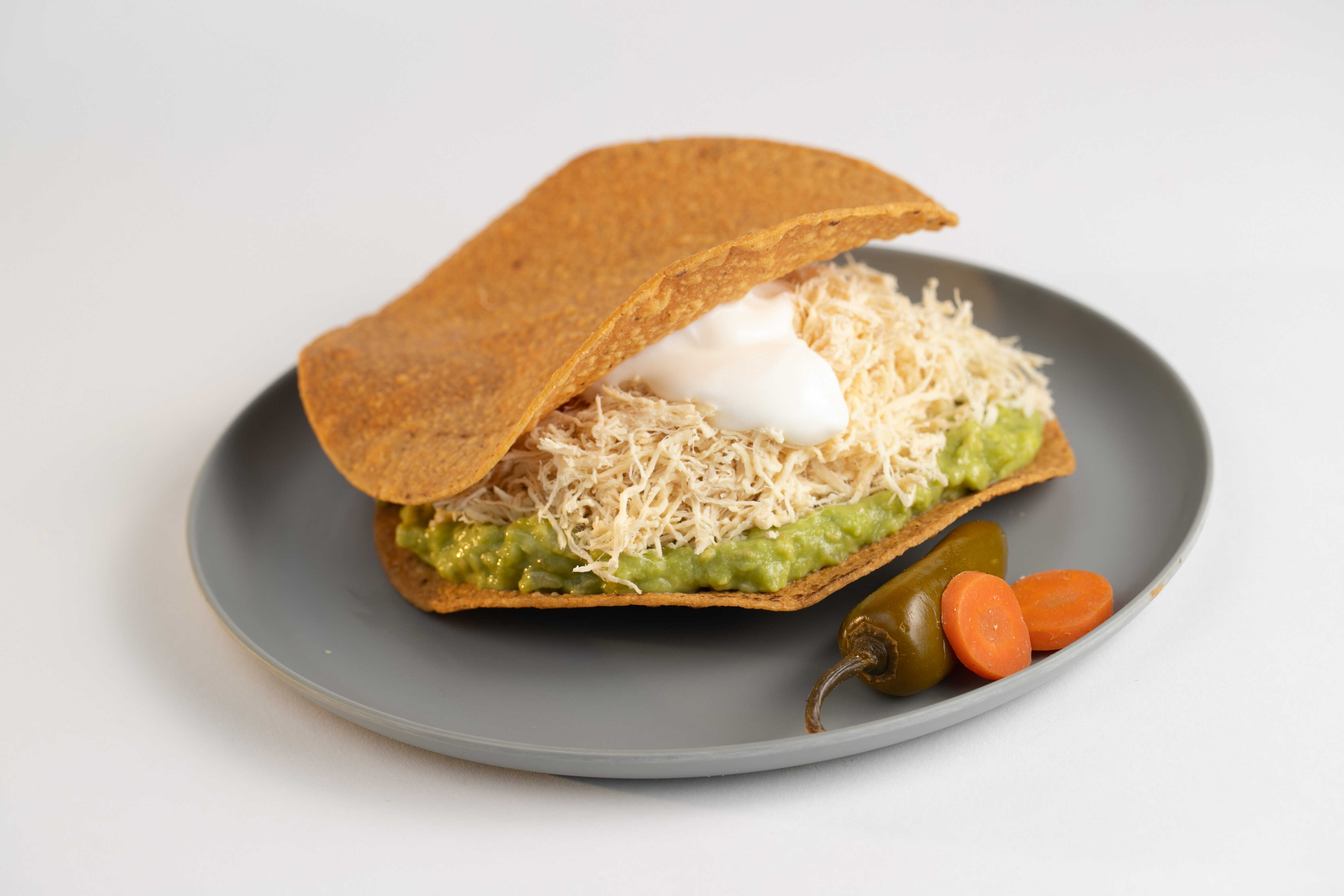 2 Tostadas deshidratadas, Pollo desmenuzado, Guacamole y Crema
