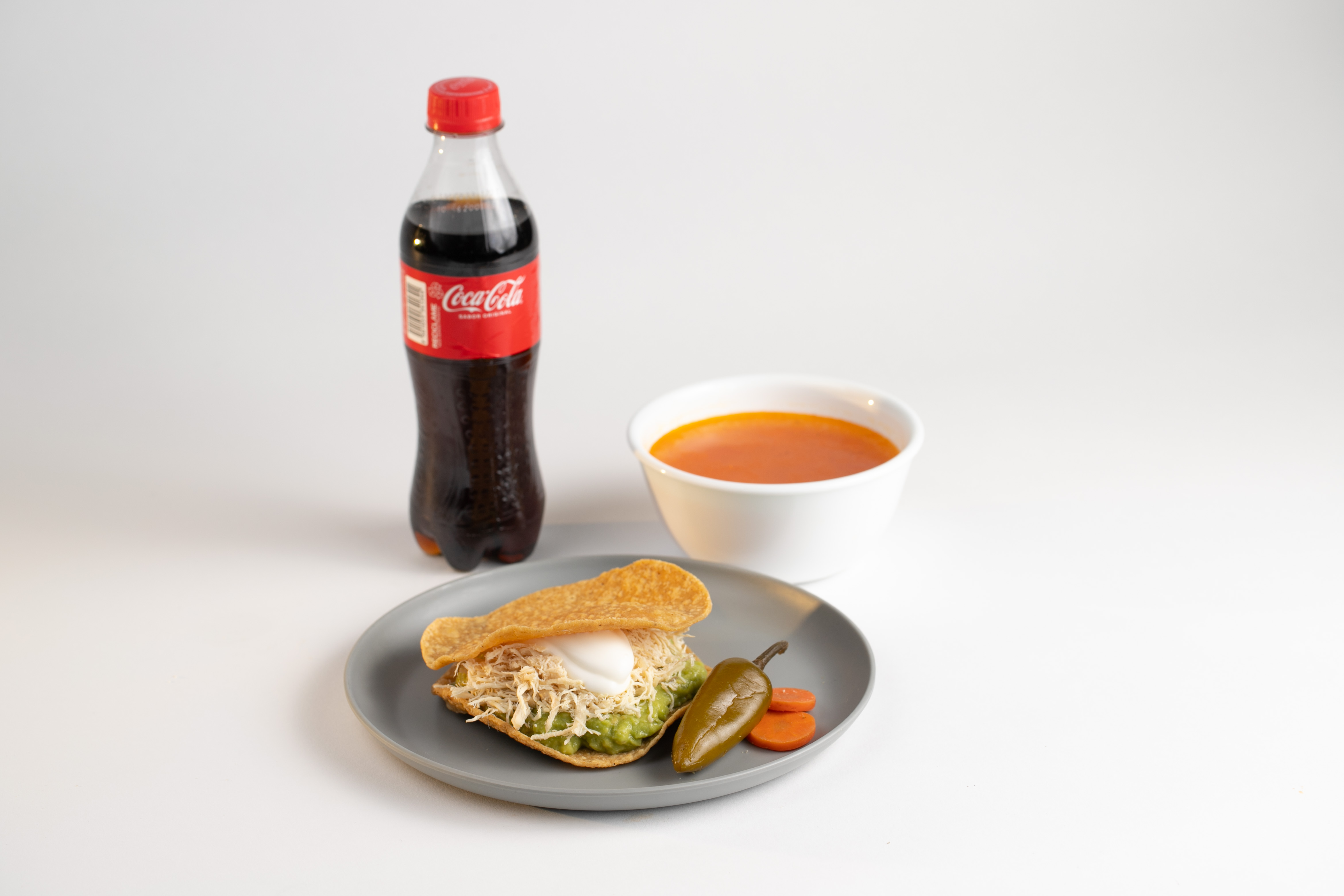Tostada Jr. con Guacamole, Pechuga de Pollo desmenuzada y Crema + 1 Complemento a elegir + 1 Refresco.