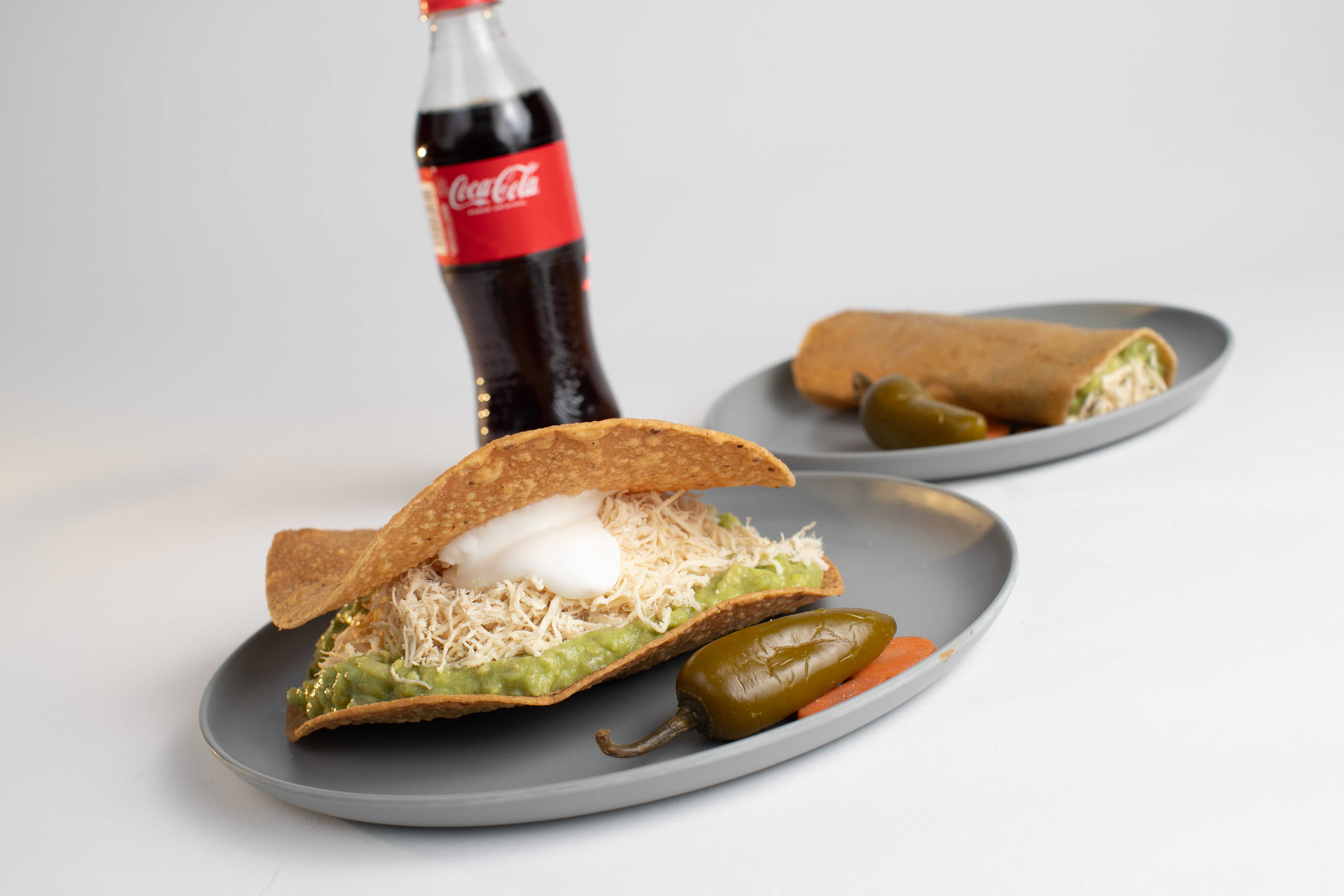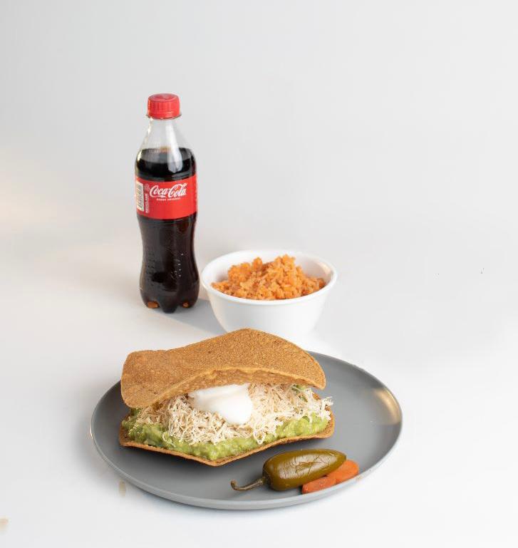 1 Tostada Gigante con Aguacate, Pechuga de Pollo desmenuzada y Crema. + 1 Taco Gigante con Aguacate, Pechuga de Pollo desmenuzada, y Crema + 1 Refresco 355ml.