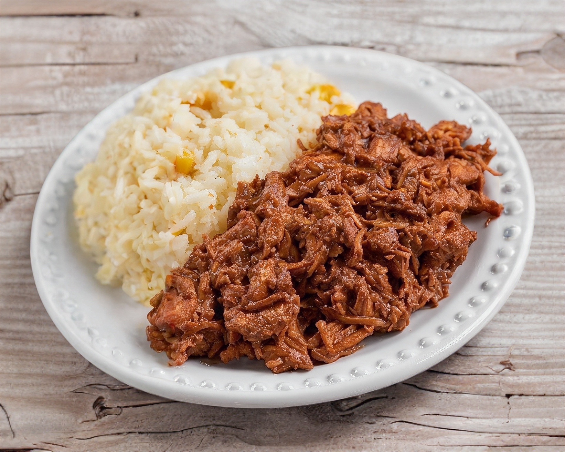 En platillo, poblano, con pollo deshebrado, acompañado de arroz y frijoles refritos