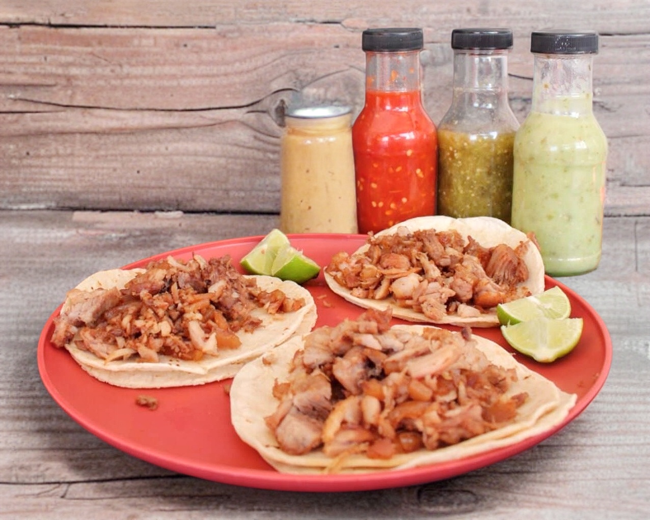 1/4 kg de carnitas acompañadas de tortillas, salsa, limones y pico de gallo