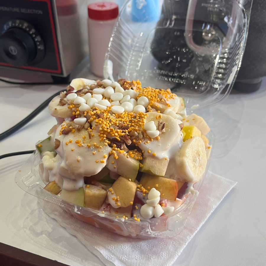 7 tipos de fruta melon, papaya, manzana roja y verde, pera, fresa, platano y tres toppings a elegir chispas de chocolate y blancas, oreo, coco dorado, coco, nuez, amaranto, arandano, chispas de colores, luneta, luneta de yogurt, granola, arroz inflado