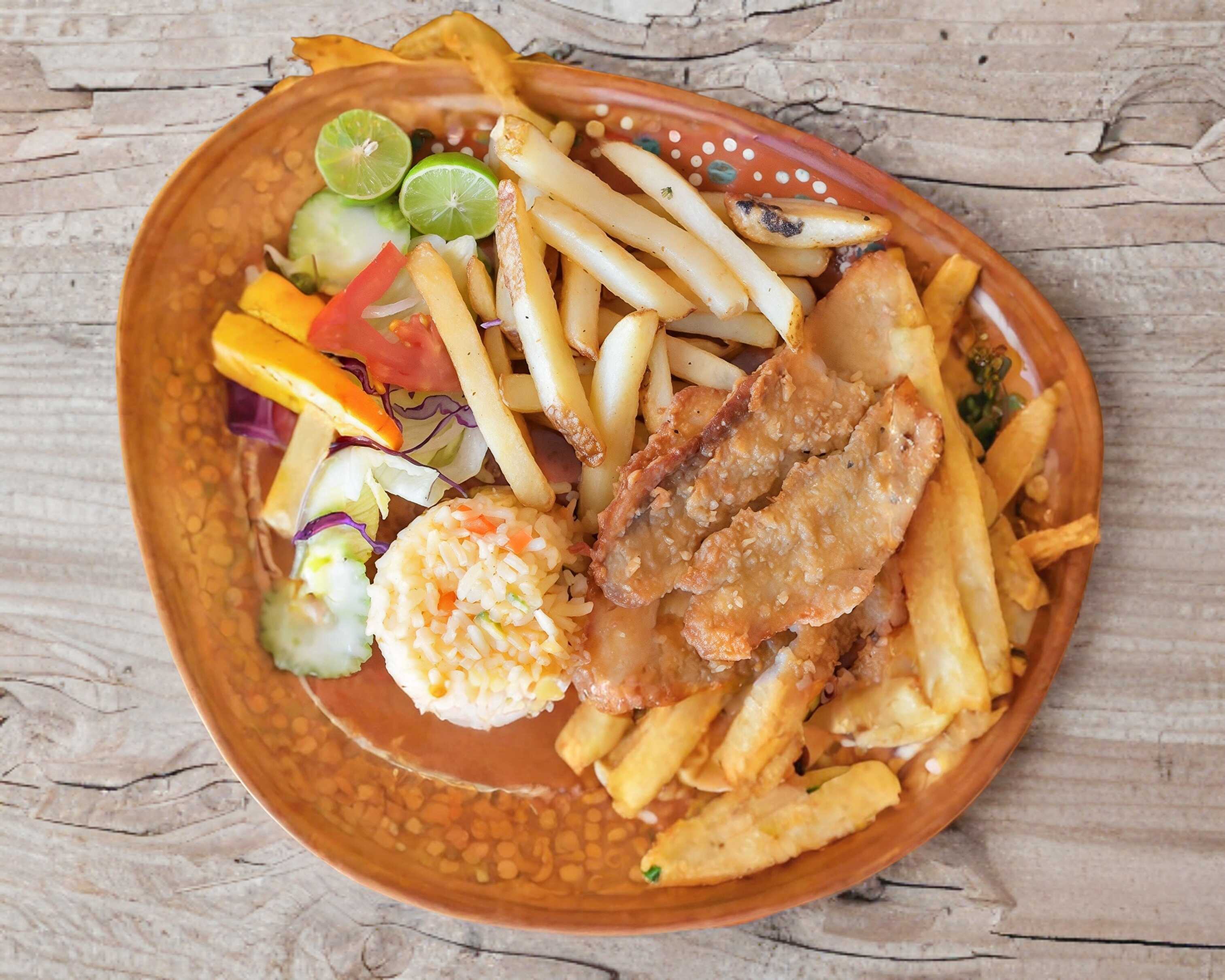 Acompañado de arroz, ensalada y papas a la francesa.