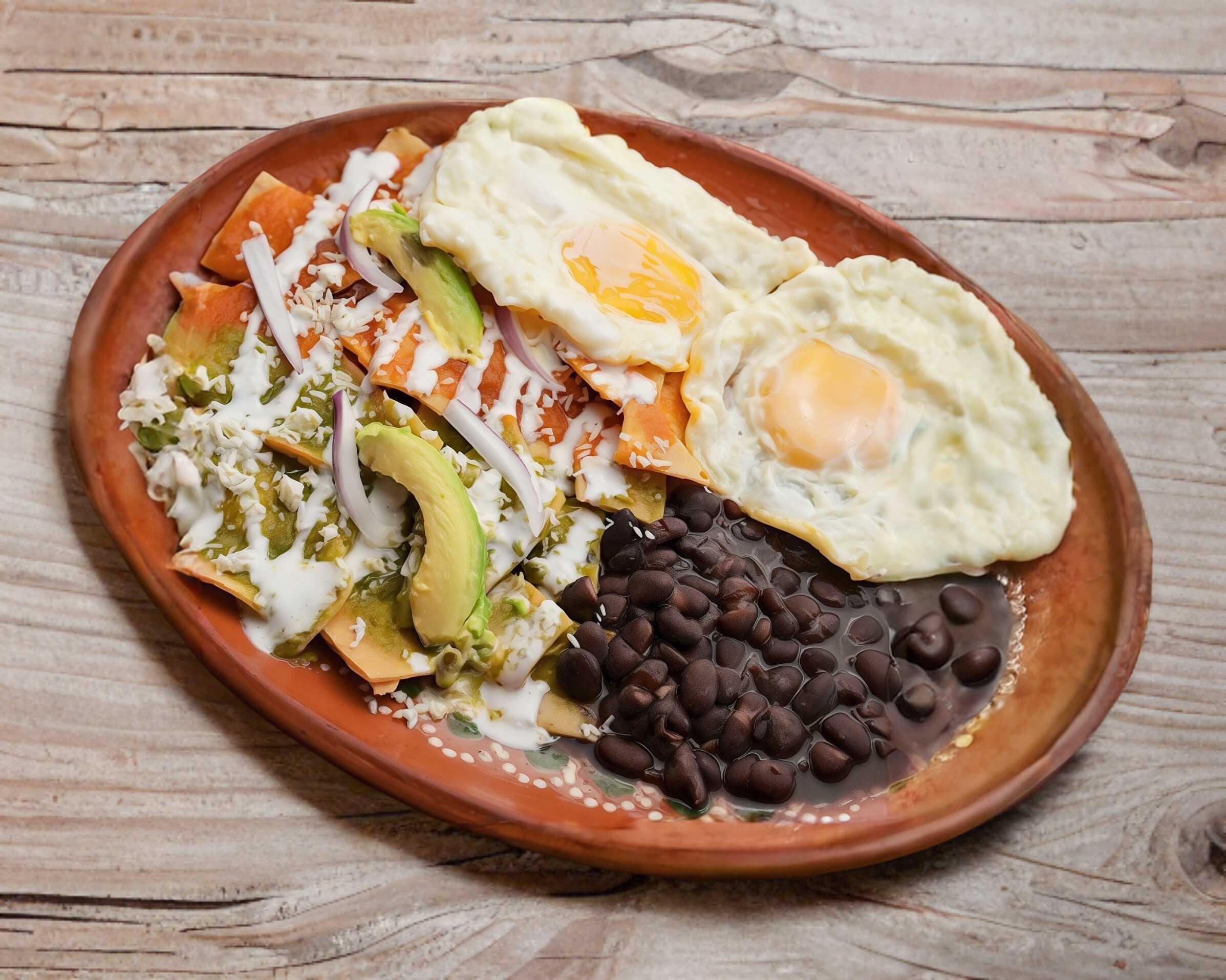 Chilaquiles, totopos con salsa a eleccion, con queso, cebolla y frijoles negros.
