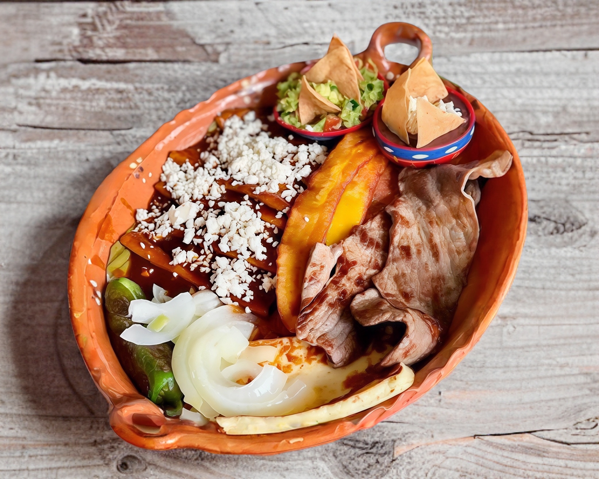 5 piezas acompañadas de guacamoles, cebolla dorada y chile toreado.