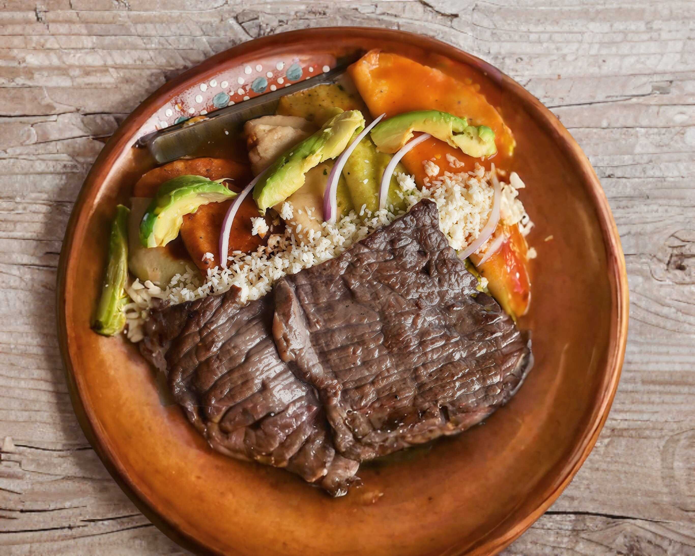 3 enchiladas huastecas, frijoles negros, cebolla morada, chile toreado, plátano macho frito, queso oaxaca y guacamole.