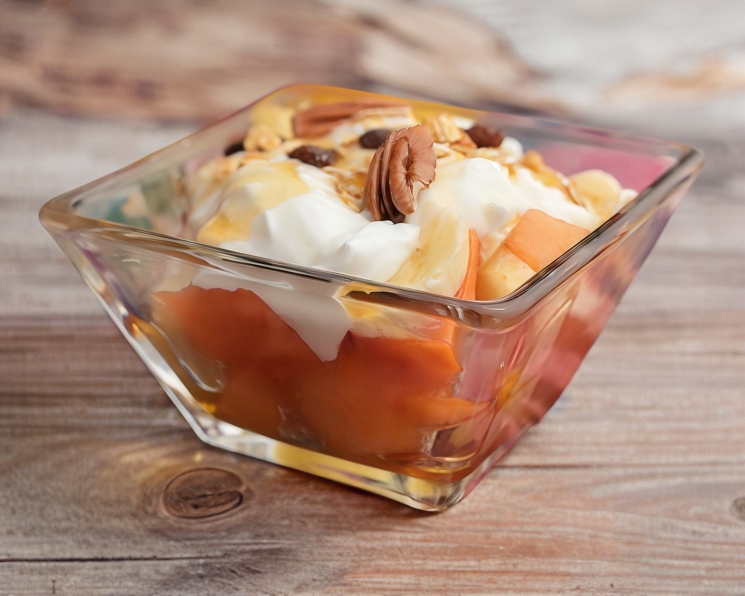 Combinacion de frutas de temporada, con yoghurt natural, granola y miel de abeja.