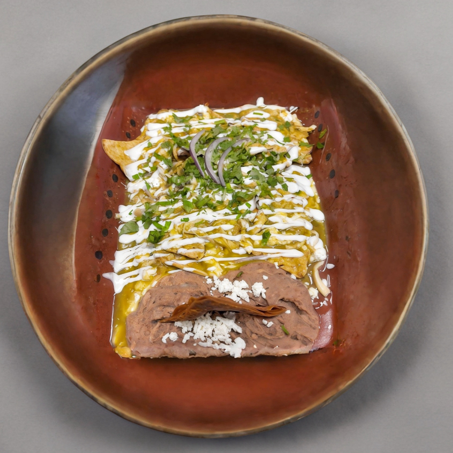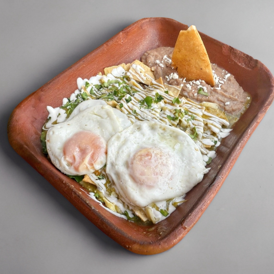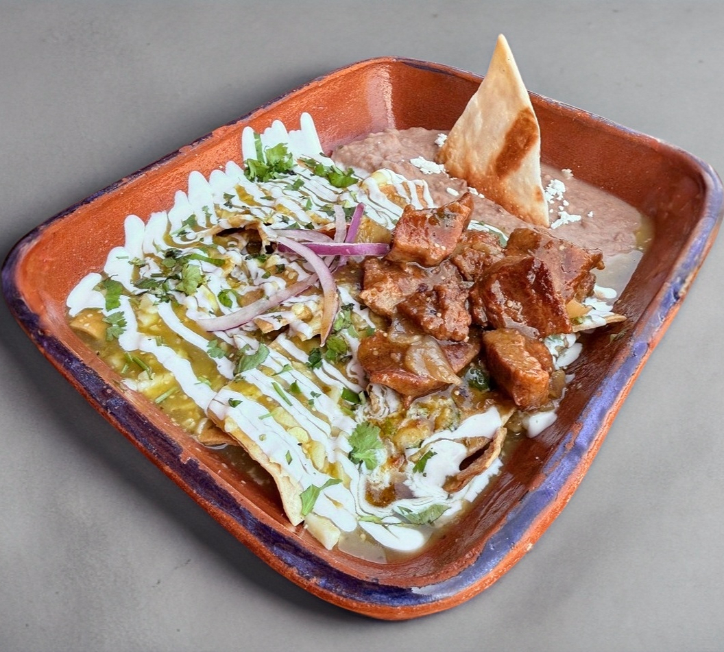 Acompañado de tortillas de harina, chilaquiles con chicharrón crujiente, en salsa a elección, acompañados de frijoles refritos.