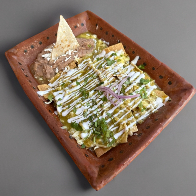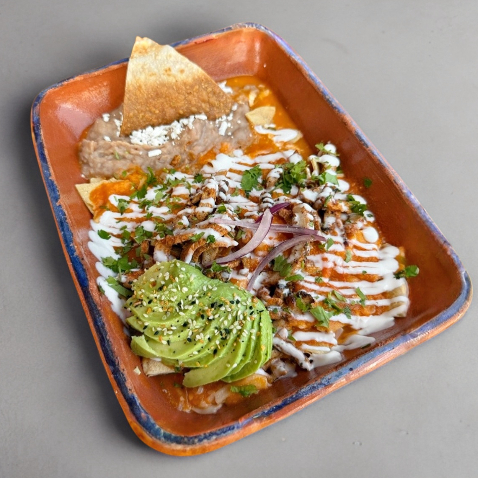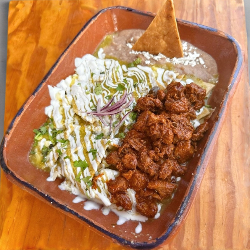 Acompañado de tortillas de harina, chilaquiles con pollo y huevo, mitad en salsa verde y mitad en roja, acompañados de frijoles refritos.