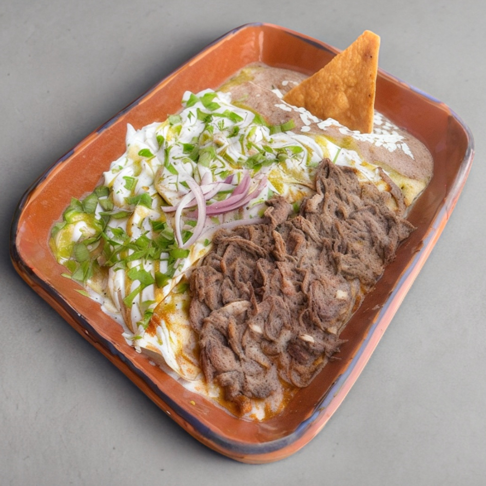 Acompañado de tortillas de harina, chilaquiles con barbacoa jugosa, bañados en salsa a elección y acompañados de frijoles refritos.