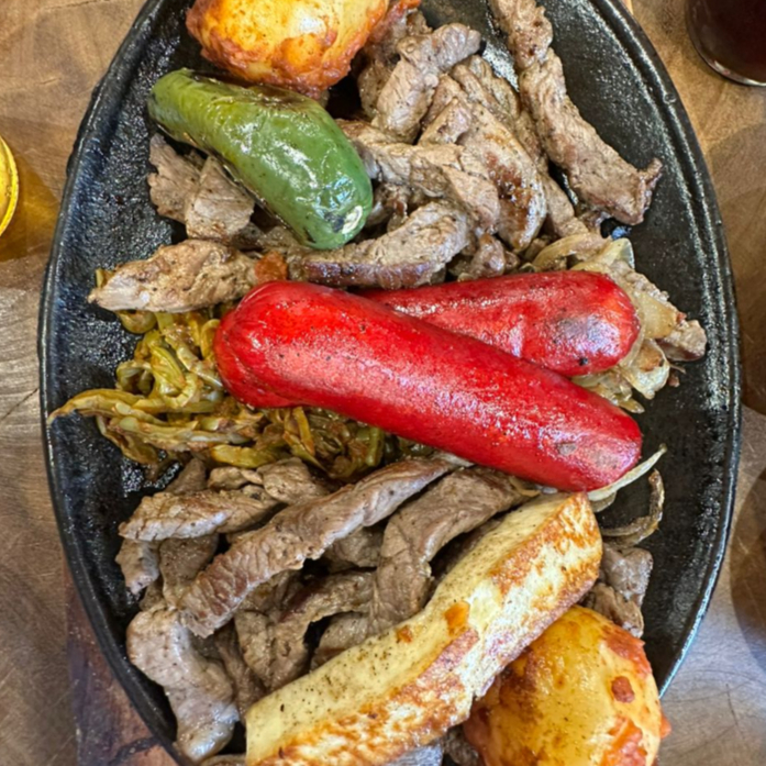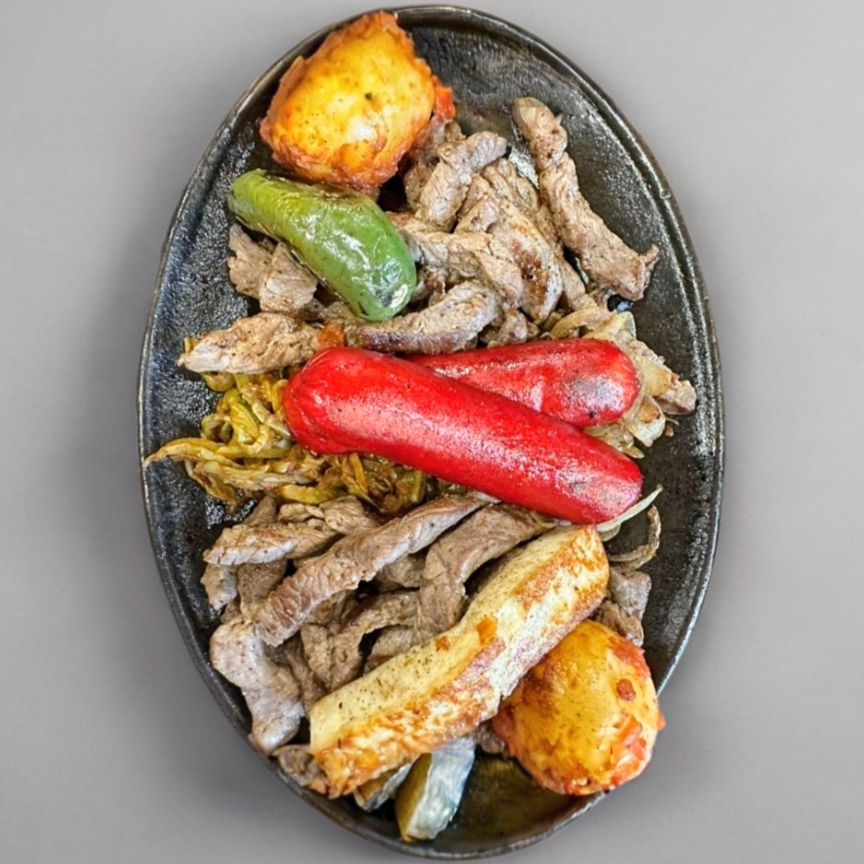 500 gr De carne, acompañada de salchicha, cebolla asada, nopalitos asados, 1/2 litro de frijoles charros, papitas cambray, queso panela, tortillas de maíz, limones y salsas.