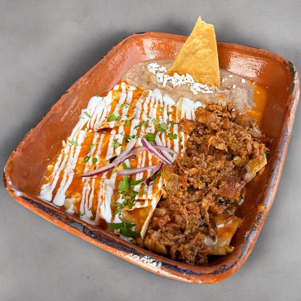 Acompañado de tortillas de harina, chilaquiles bañados en salsa roja con suculento asado de puerco y frijoles refritos.