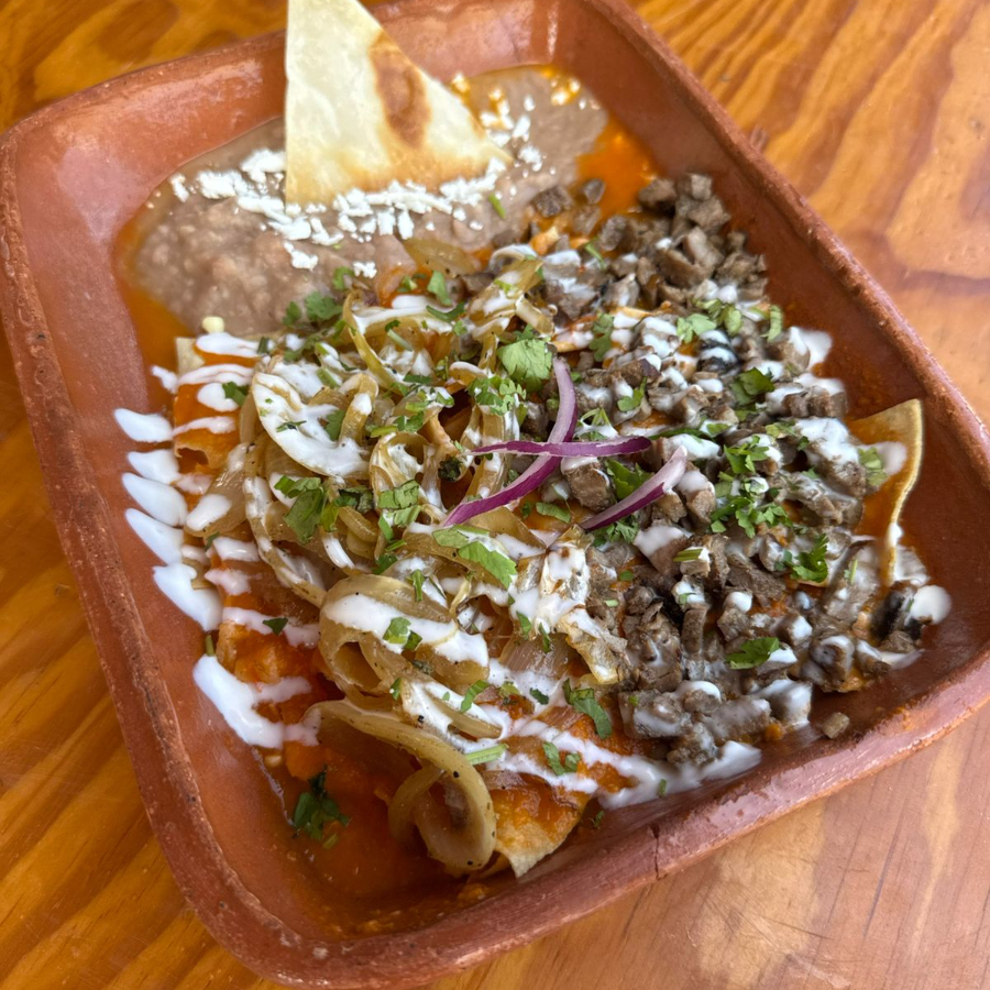 Acompañado de tortillas de harina, chilaquiles con carne asada y cebolla asada, en salsa a elección, acompañados de frijoles refritos.