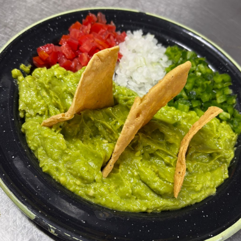 Guacamole sazonado, servido con tomate, cebolla y chile picado aparte.