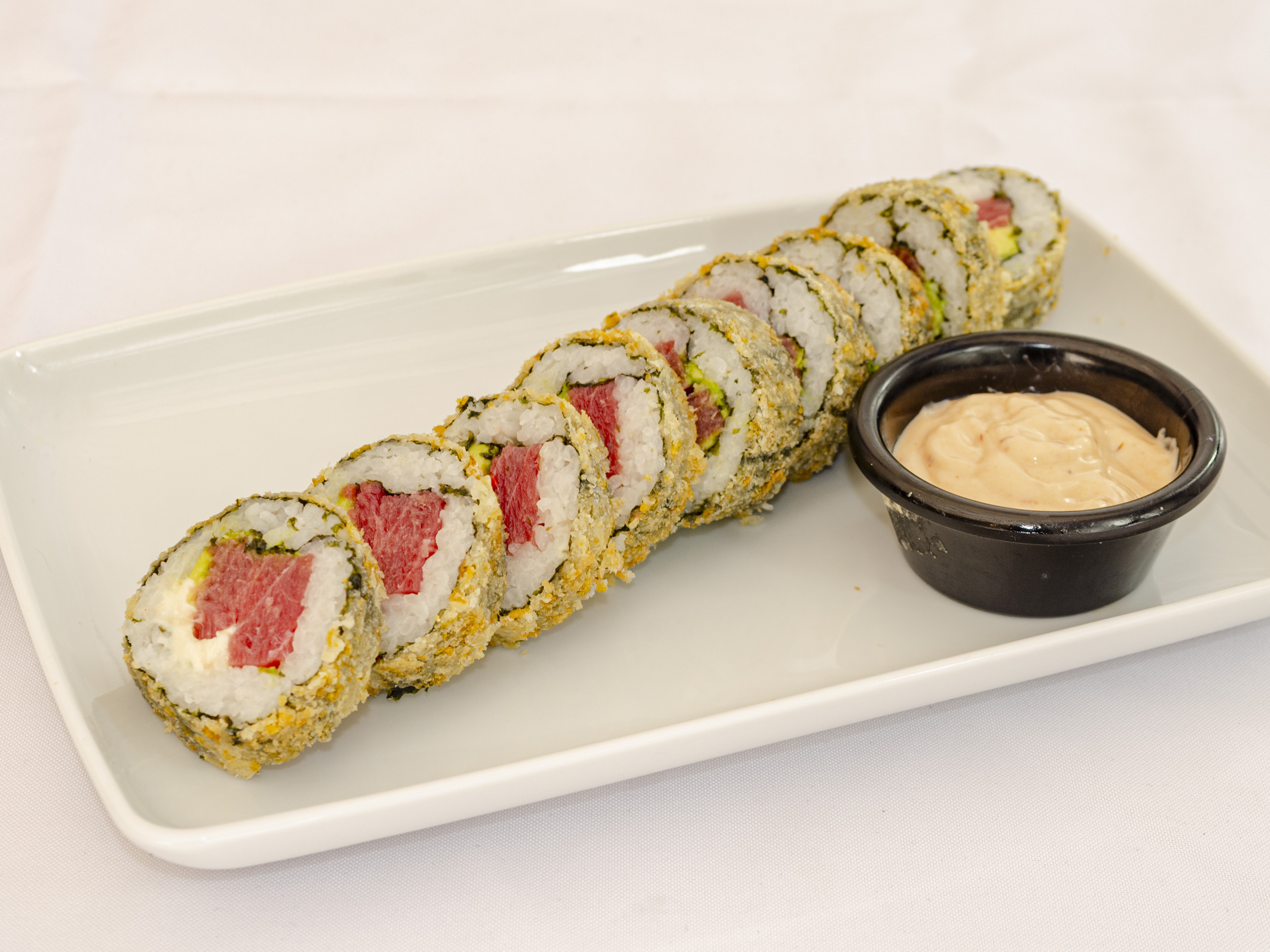 Atún, aguacate, chipotle, pepino. pf: empanizado con alga