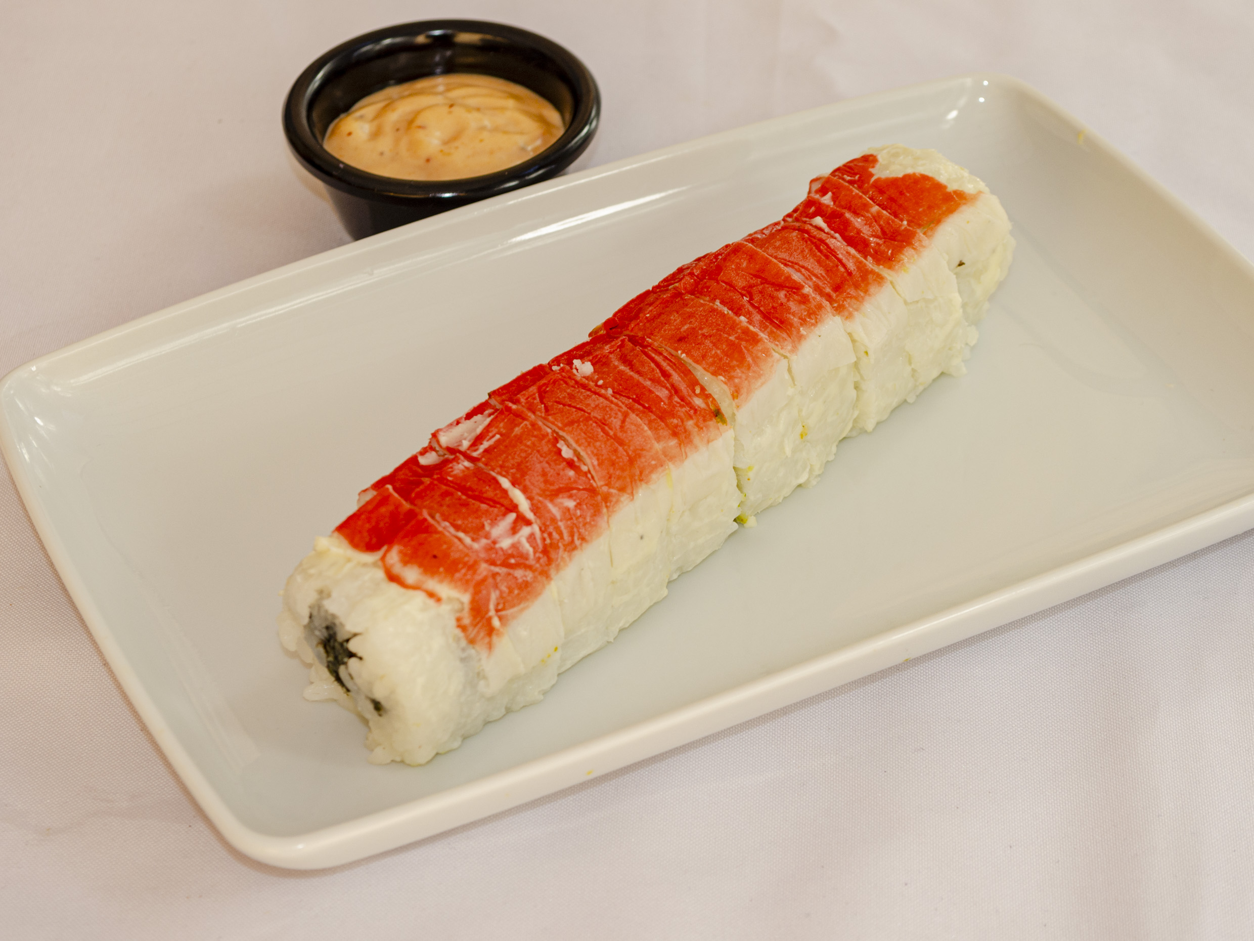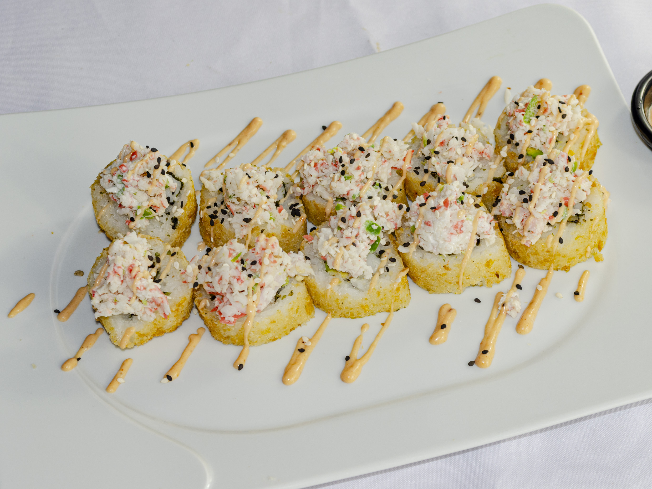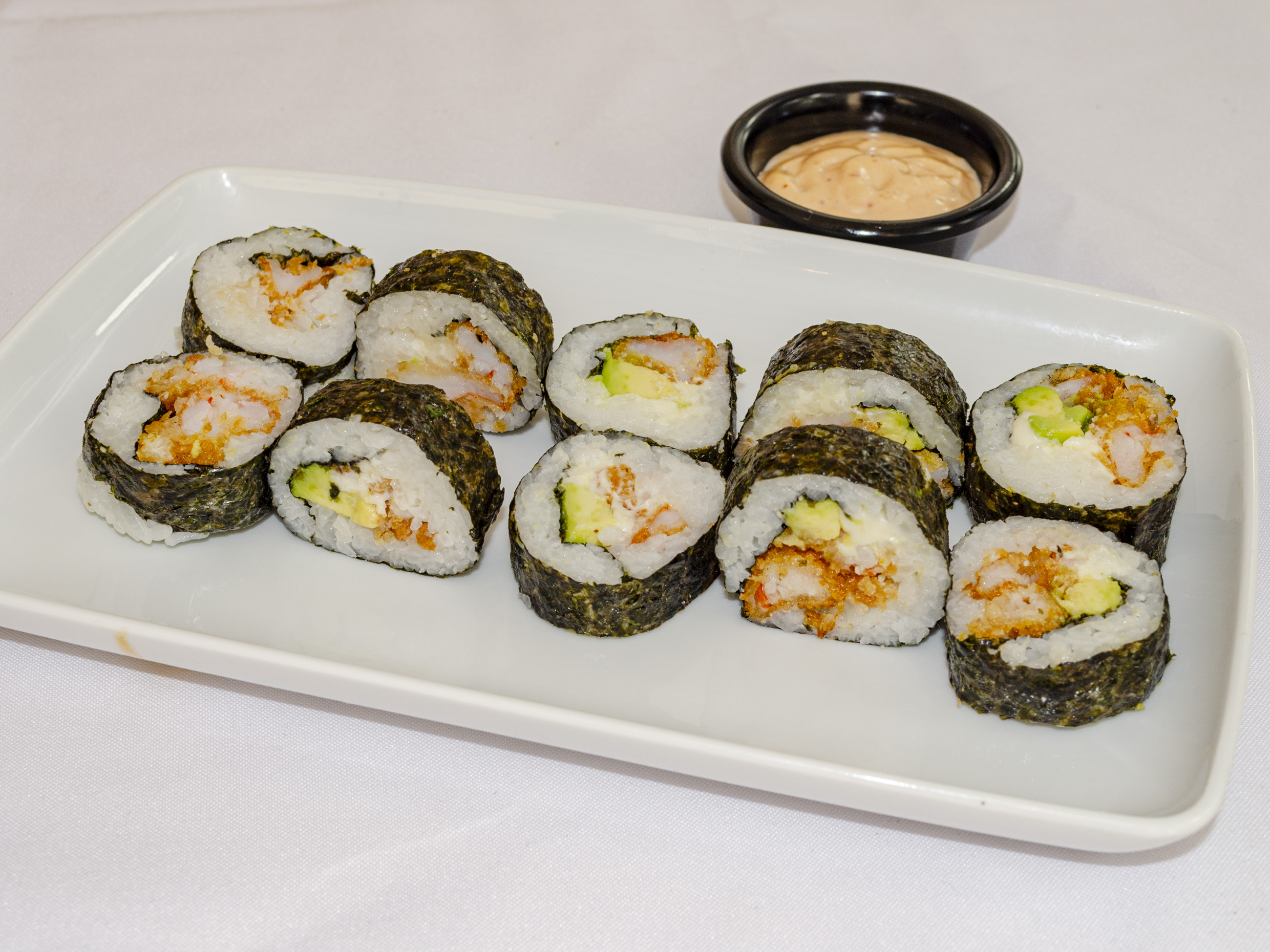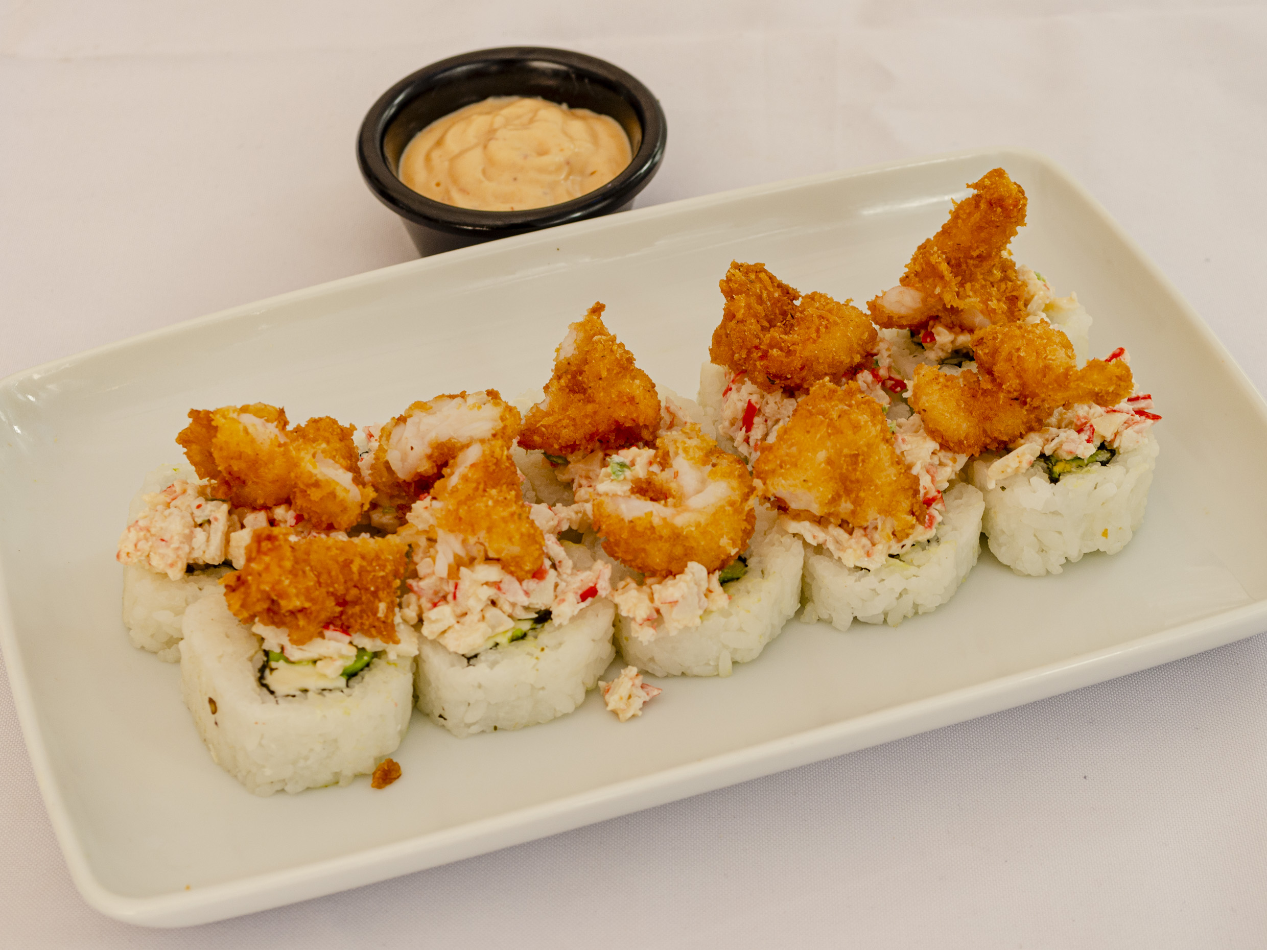 Camarón, surimi, queso crema y aguacate por fuera tampico y adereso chipotle.