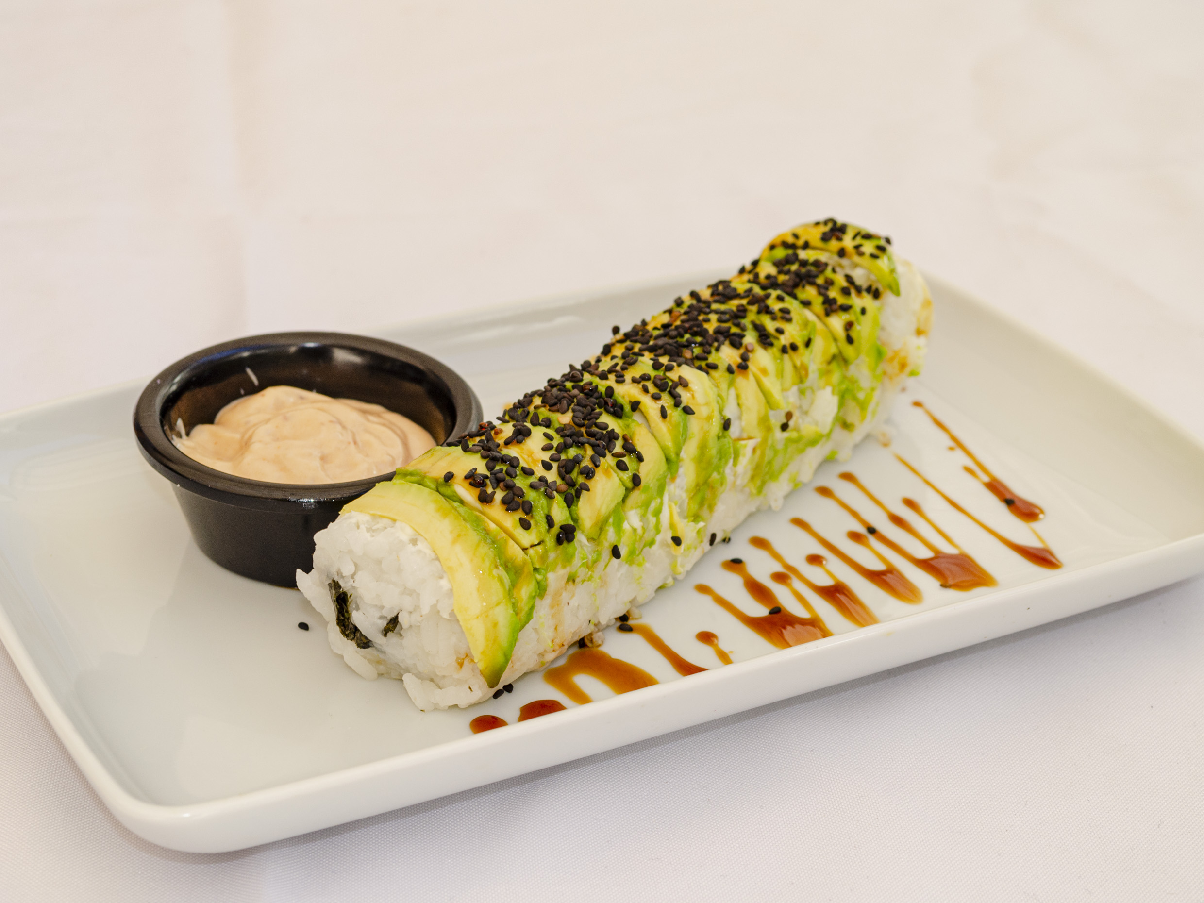 Camarón, surimi, queso crema, y aguacate forrado de aguacate y ajonjolí.