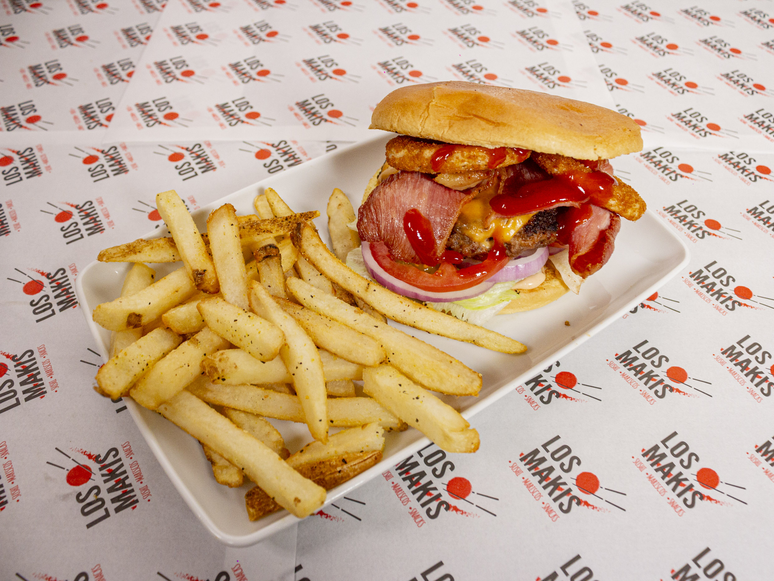 Carne de res sazonada, queso gouda y amarillo, tocino, aros de cebolla, tomate, lechuga y aderezos. Acompañada de papas a la francesa y chiles jalapeños.