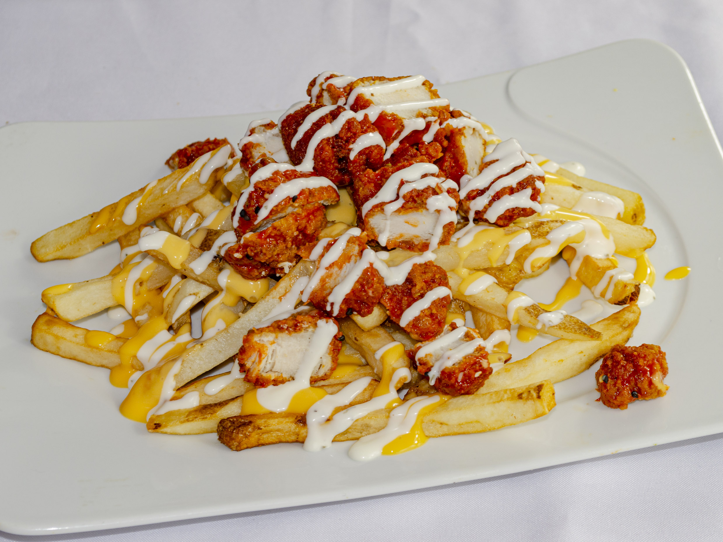 Papas a la francesa, 125g de boneless, queso amarillo y aderezo ranch.