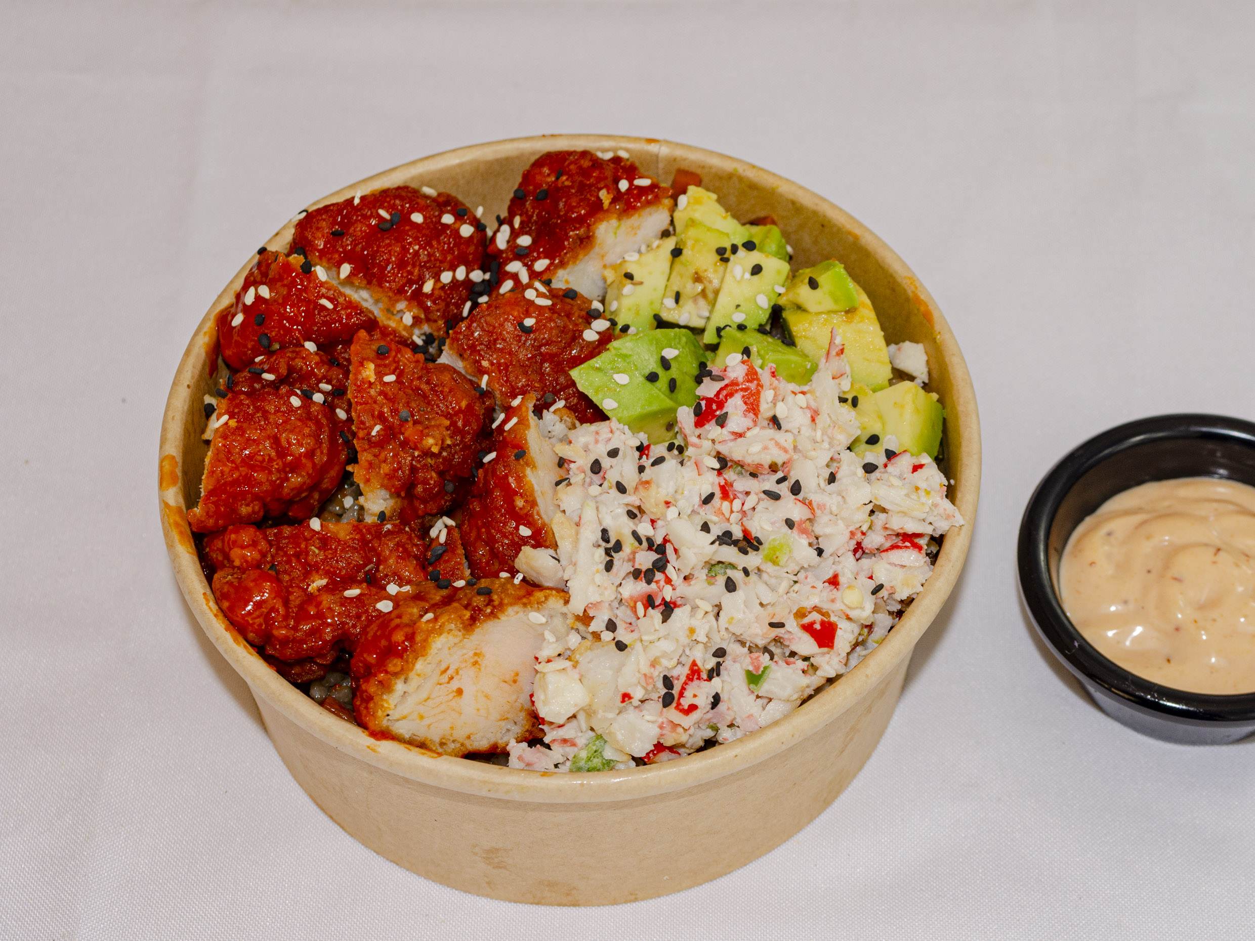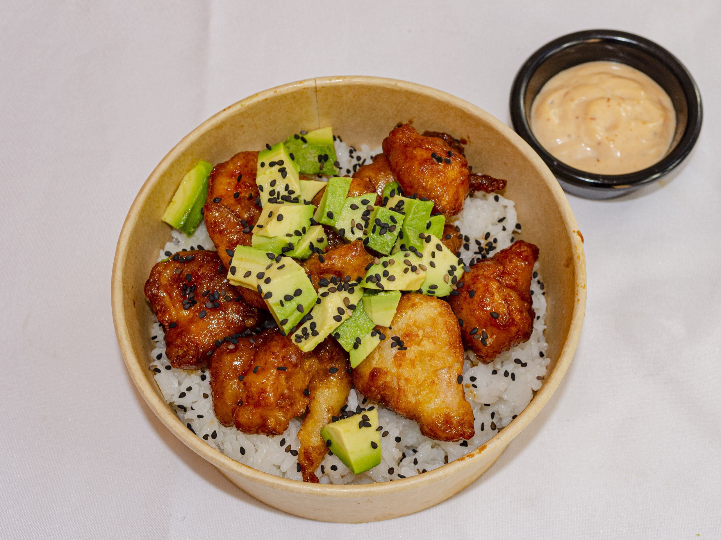 Arroz frito acompañado de tampico, Philadelphia, aguacate y boneless.