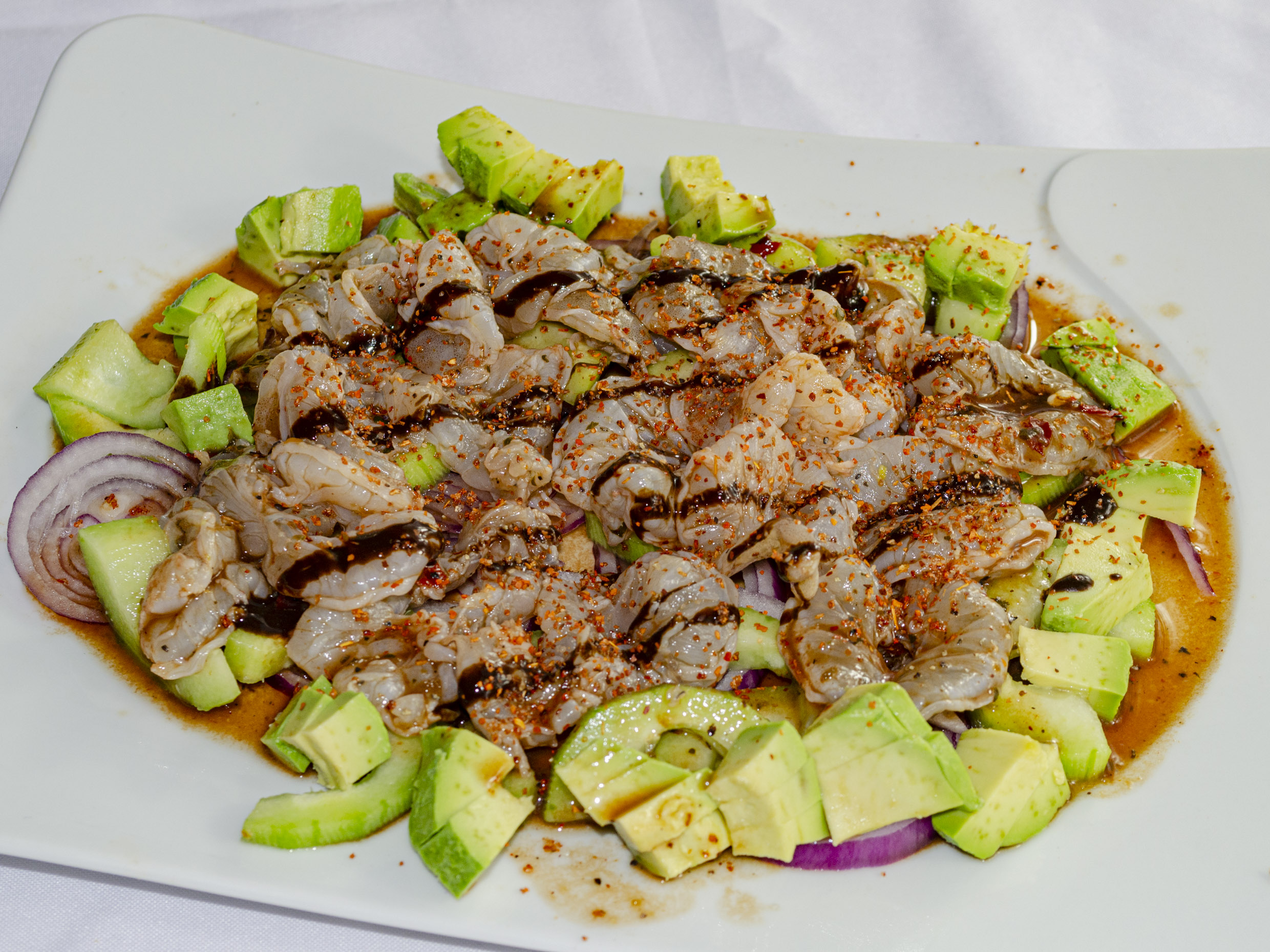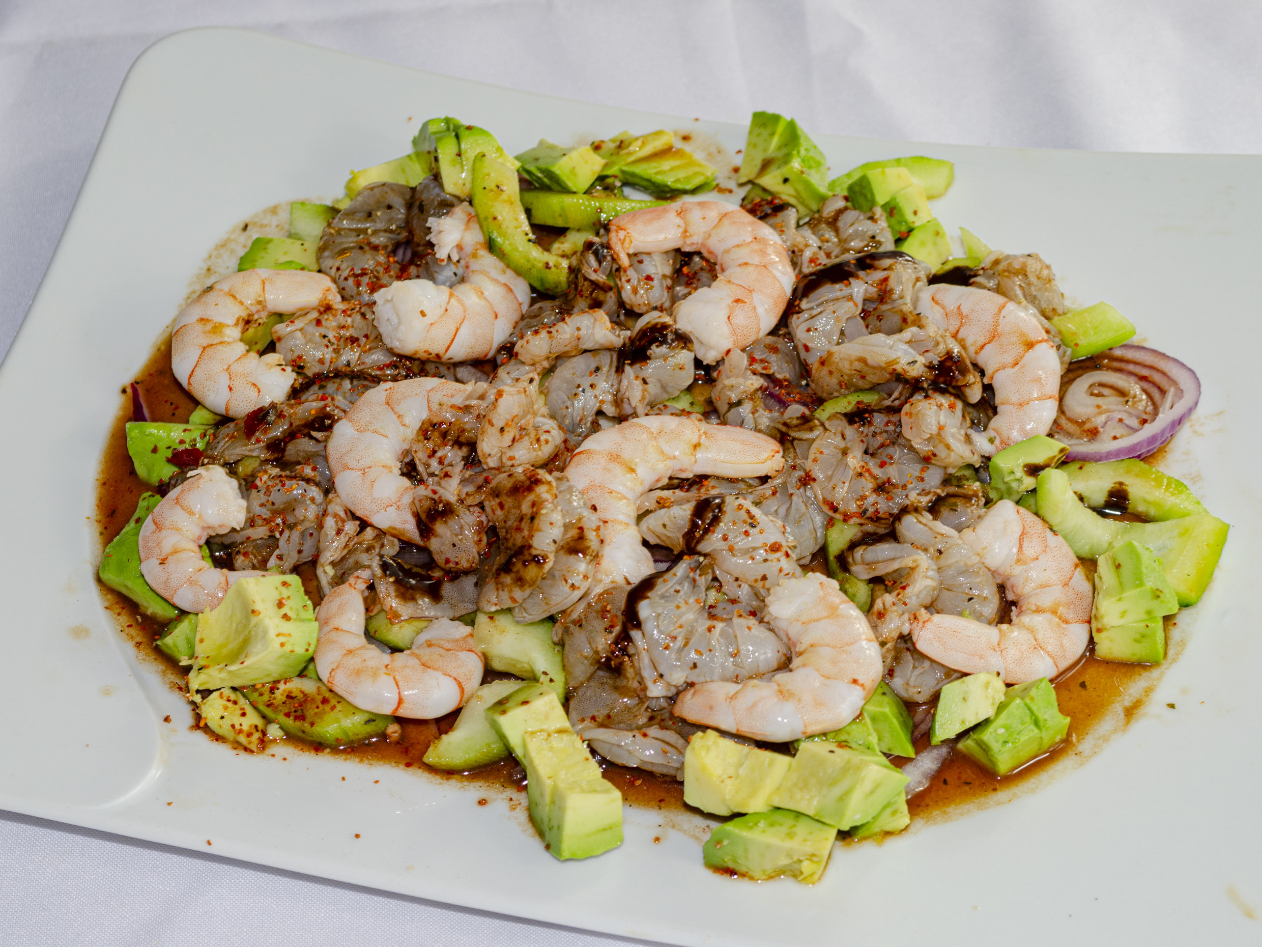 Camarón, cebolla, pepino, tomate y aguacate. Acompañado de galletas saladas.