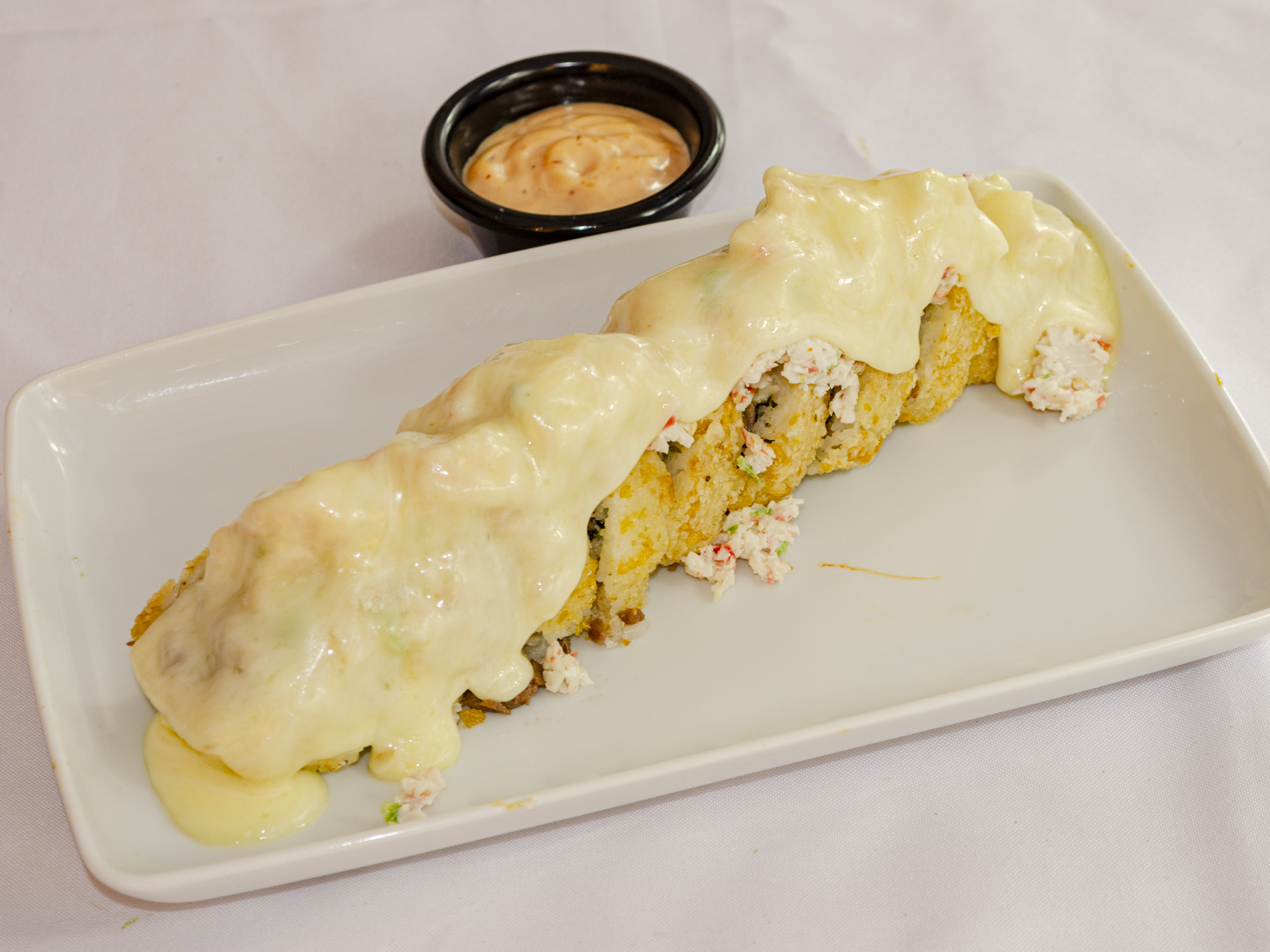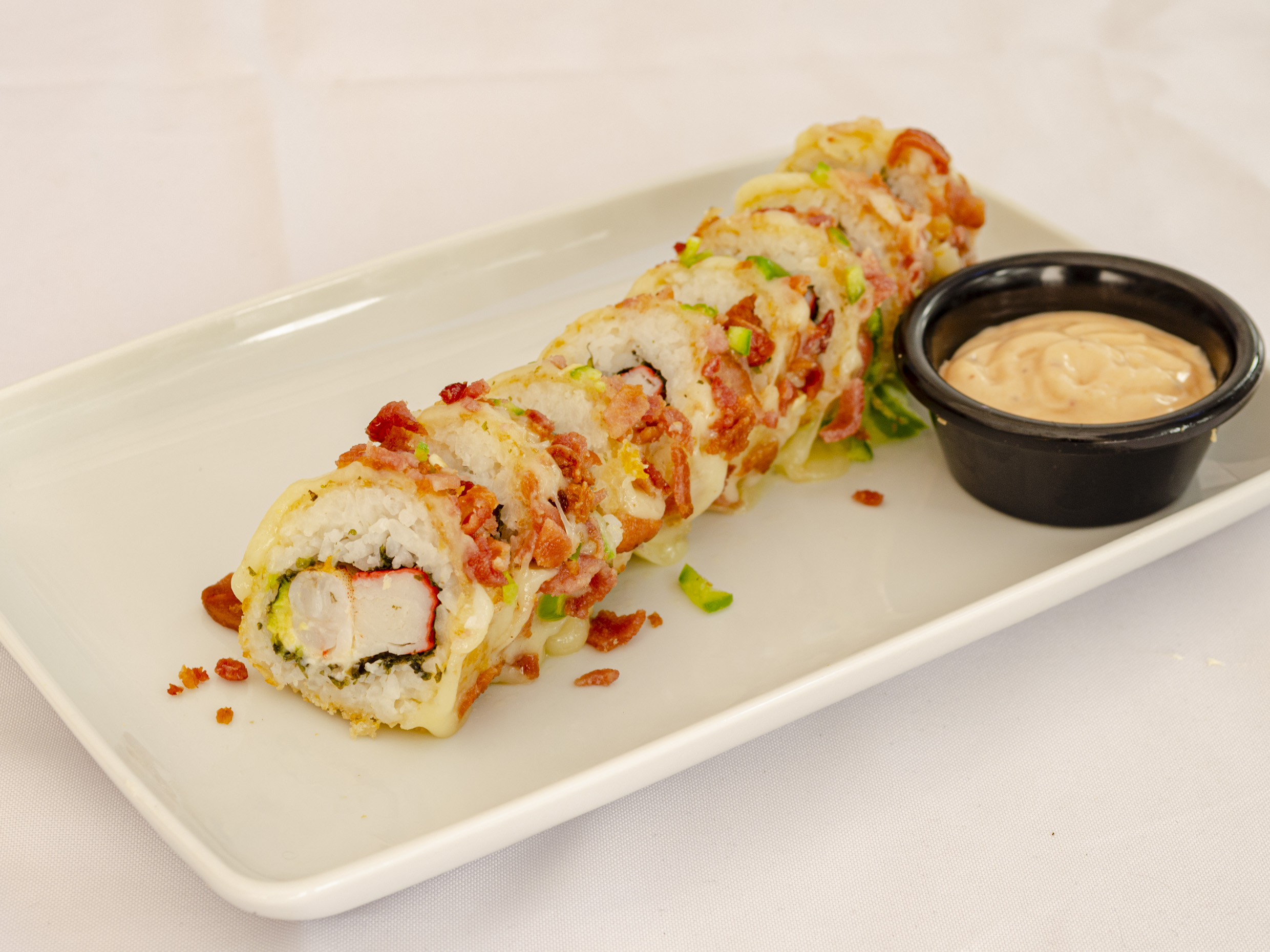 Camarón, surimi, queso crema y aguacate por fuera gratinado, rolado de tocino y serrano.