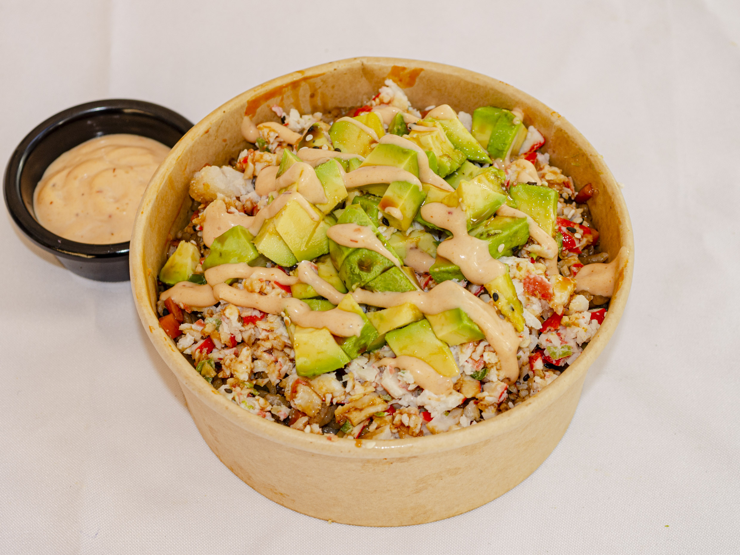 Arroz frito con verduras, tampico, aguacate, anguila, aderezo chipotle y ajonjolí