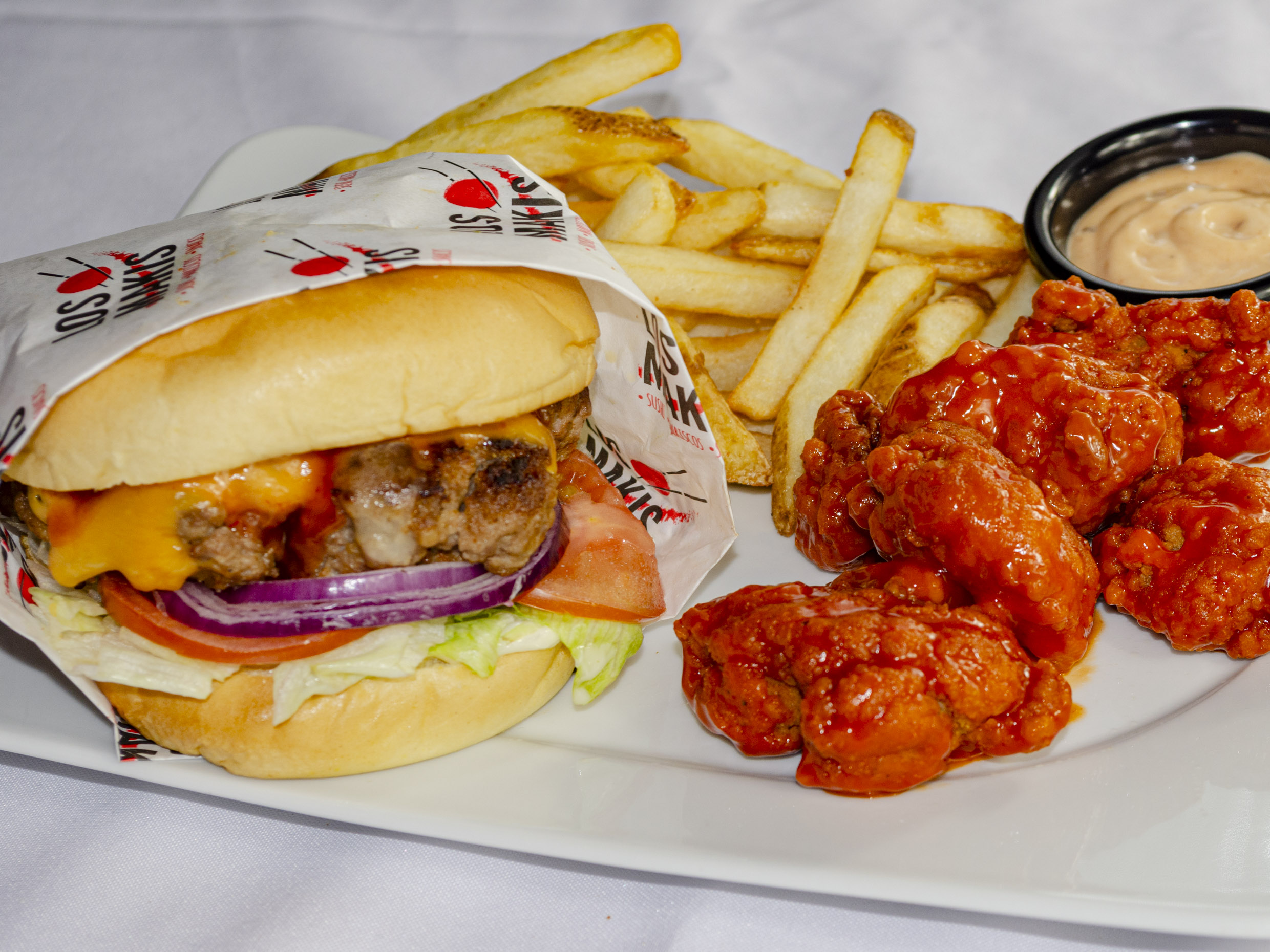 300g de boneless, 10pz de aros de cebolla, 300g de papas a la francesa y 4pz de dedos de queso.