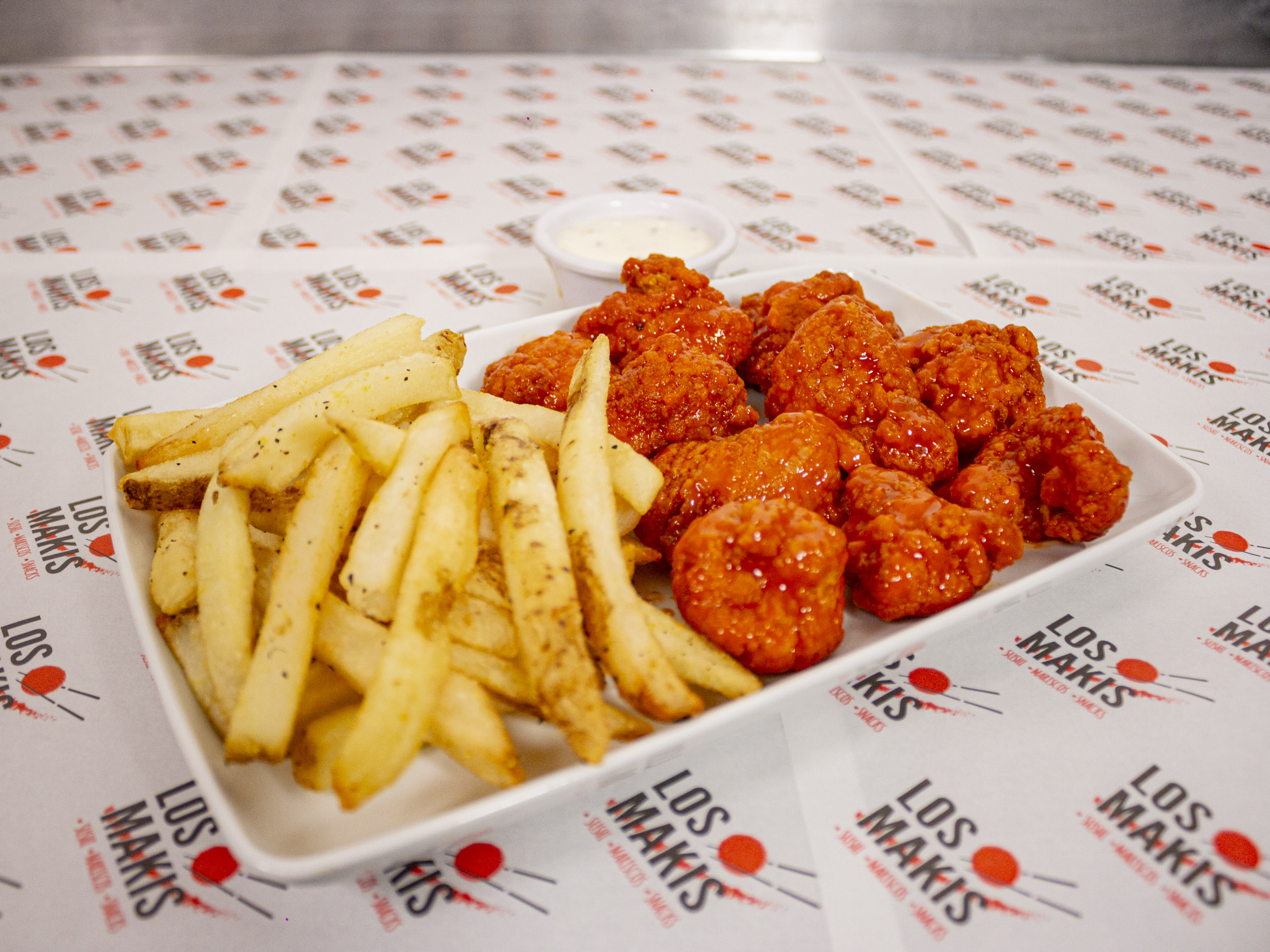 Papas a la francesa, 160g de boneless, queso amarillo y aderezo ranch.