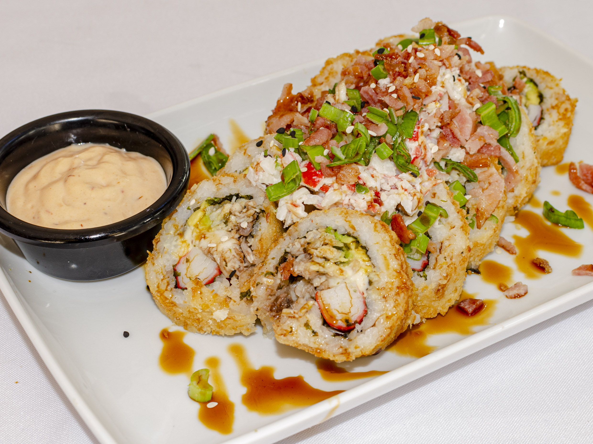 Surimi, res, queso crema y aguacate por fuera tampico, cebollín, tocino y salsa de anguila.