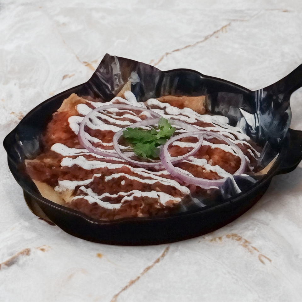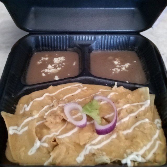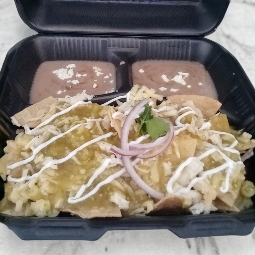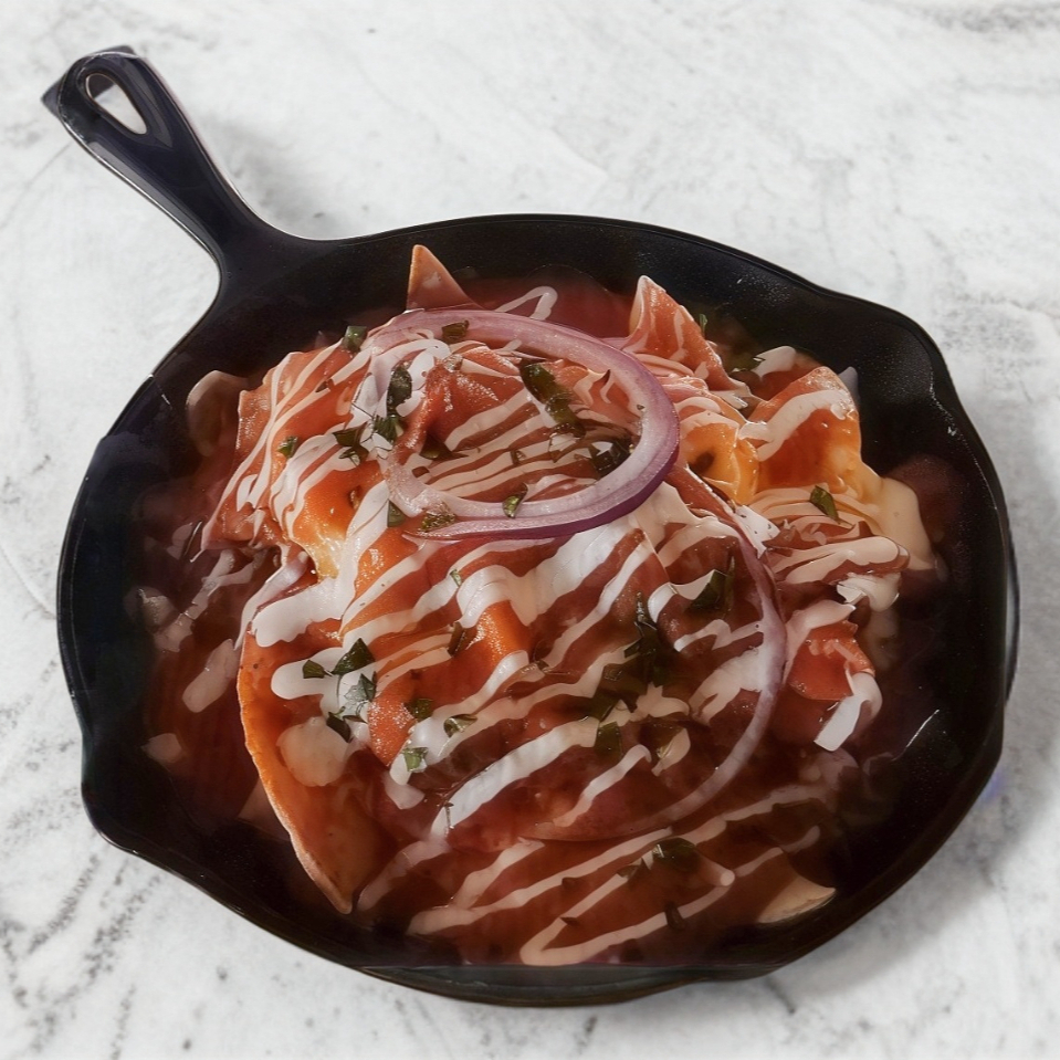 Totopo tradicional, salsa verde o roja, pollo, queso manchego, crema, cebolla morada y cilantro.
