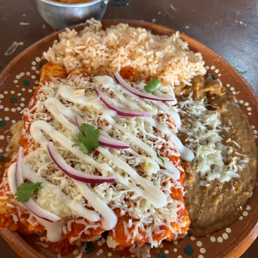 5 enchiladas de pollo bañadas en salsa de tomate con queso, crema y cebolla morada