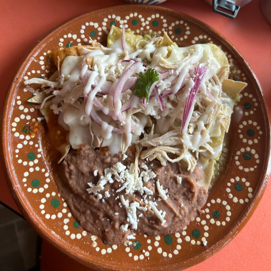 Chilaquiles con salsa, crema, queso cebolla morada y cilantro
