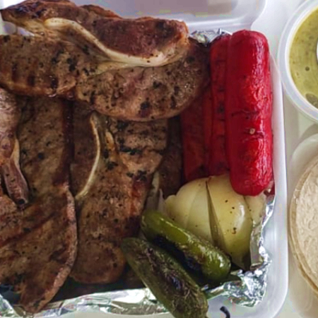 300 gr de arrachera, 1 salchicha, ½ orden de cebolla, 1 salsa mach y 5 tortillas.