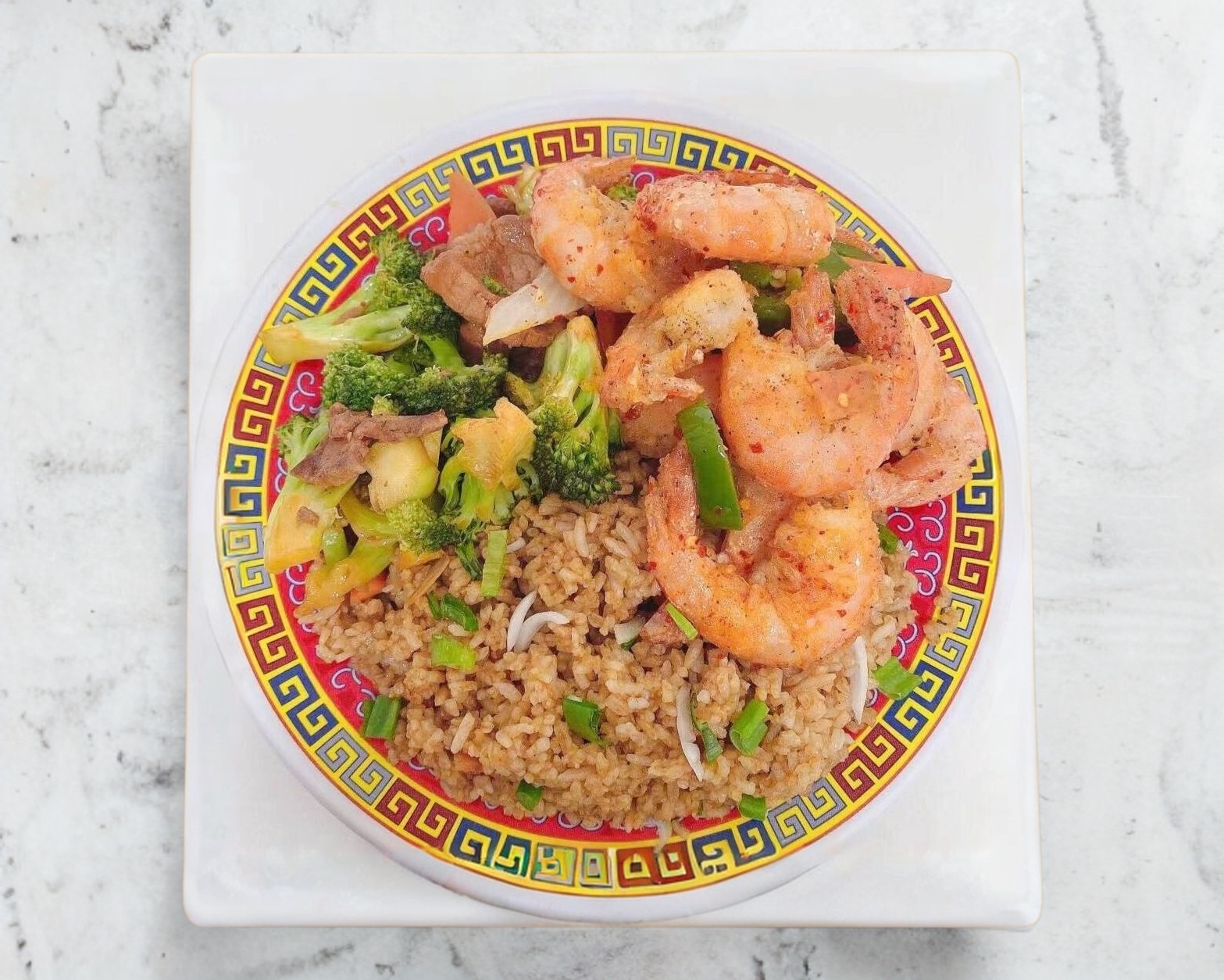 Camarón enchilado Plato Grande y arroz Frito