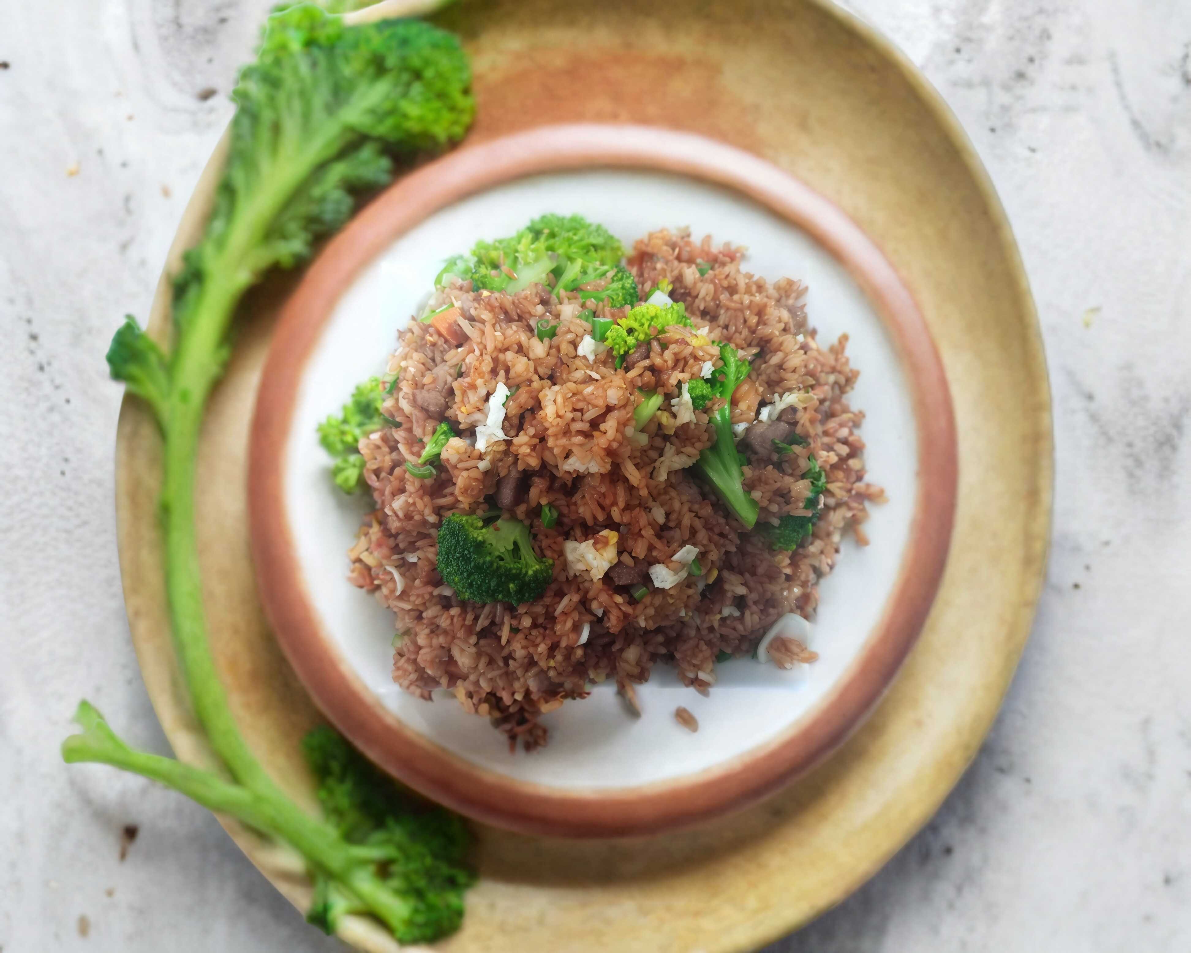 Carne de res con brócoli y arroz Frito