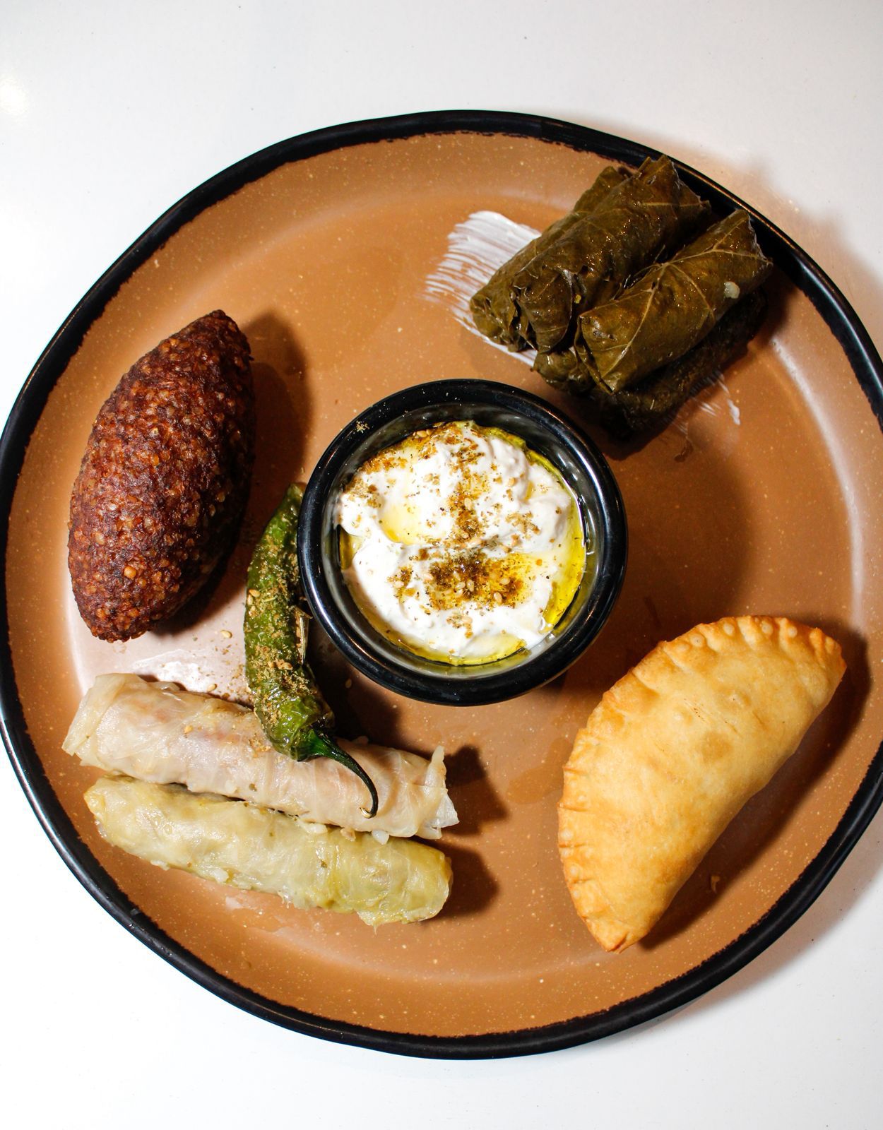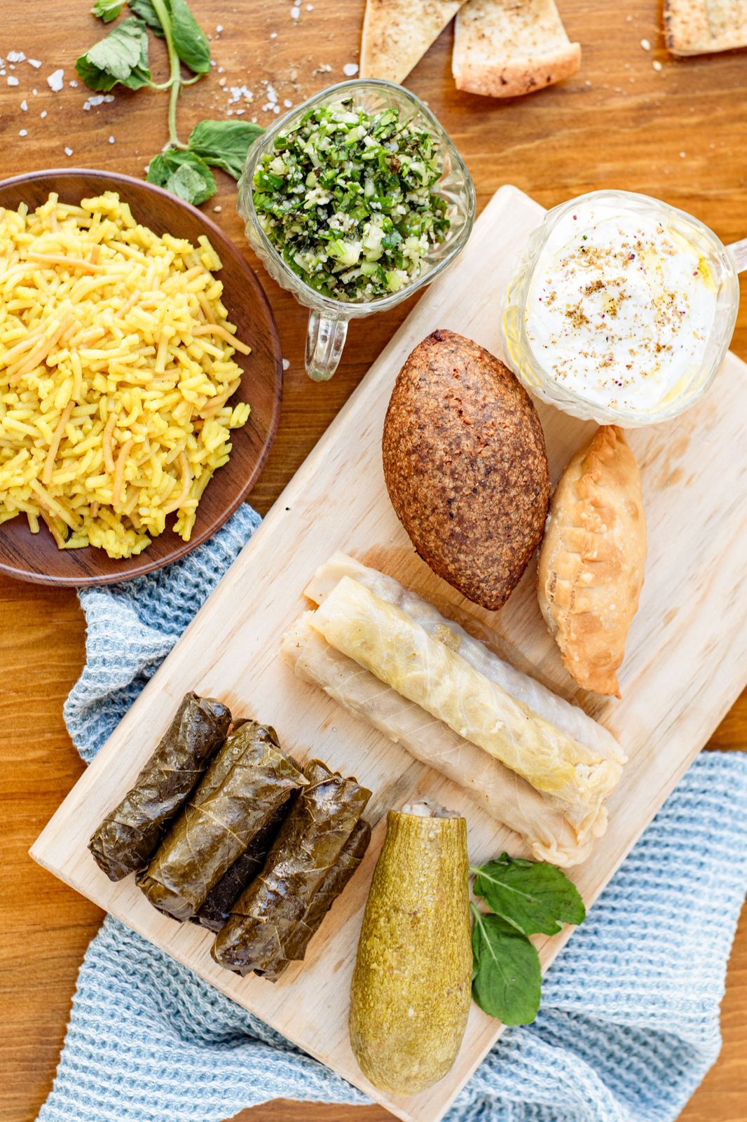 5 Hojitas de parra, 3 repollos, 1 calabacita rellena, una empanada de carne, 1 keppe bola, porción de arroz con fideos, porción de jocoque y porción de tabule.