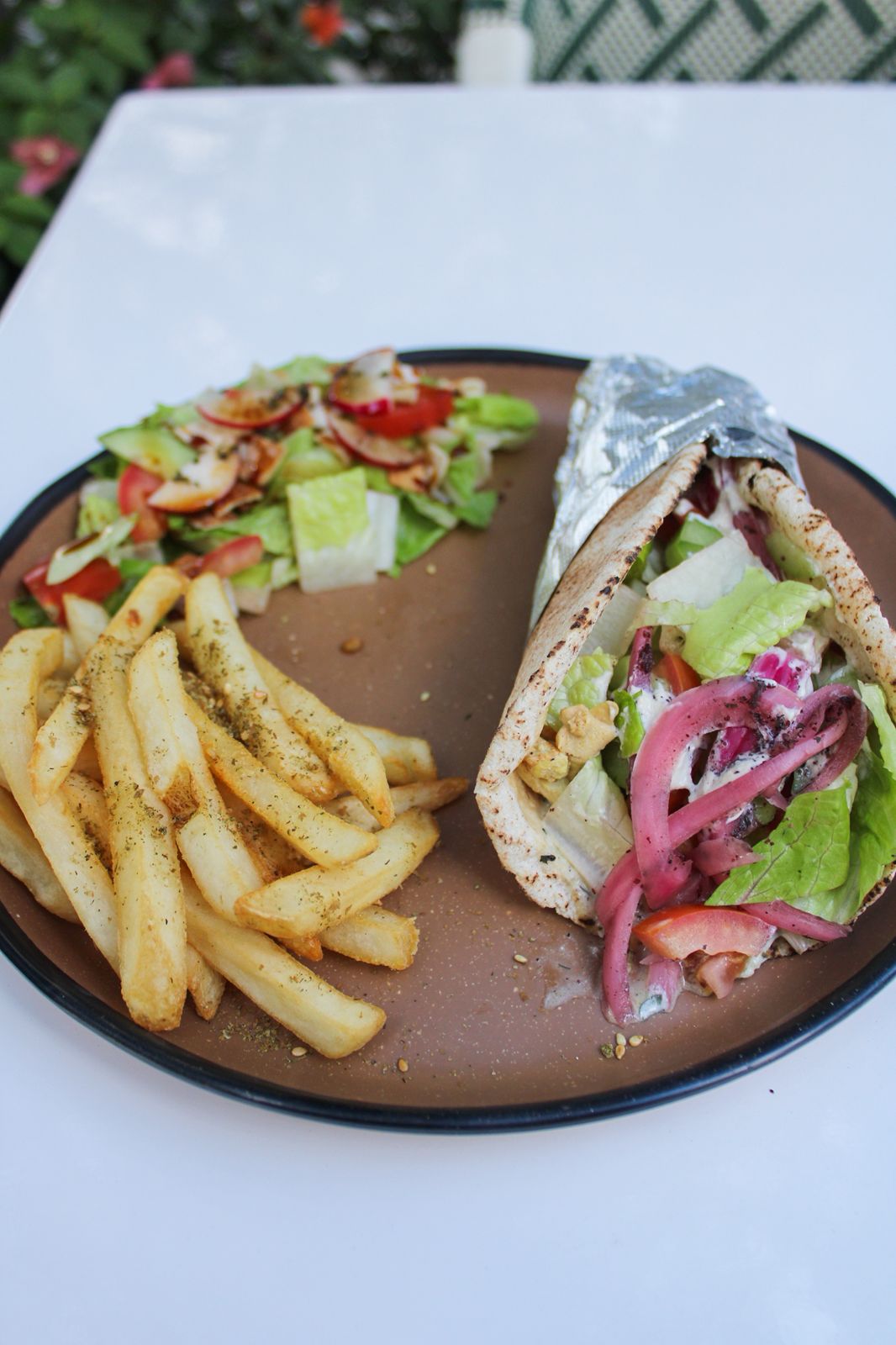 Delicioso taco árabe de pechuga de pollo marinada, pepino, tomate, cebolla curtida y las salsas de tu elección, acompañadas de papas a la francesa.