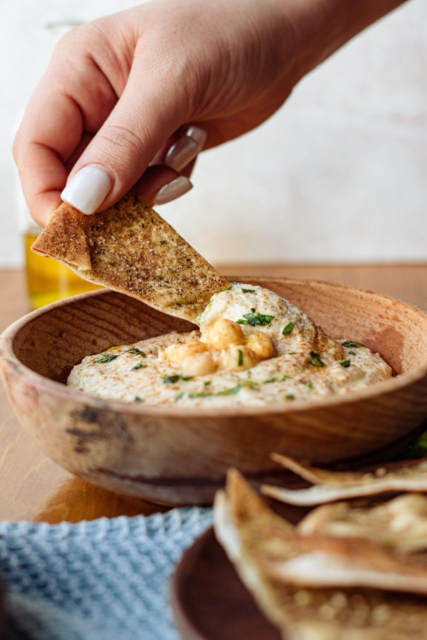 1/4 De litro de hummus, pasta de ajonjolí con garbanzo.