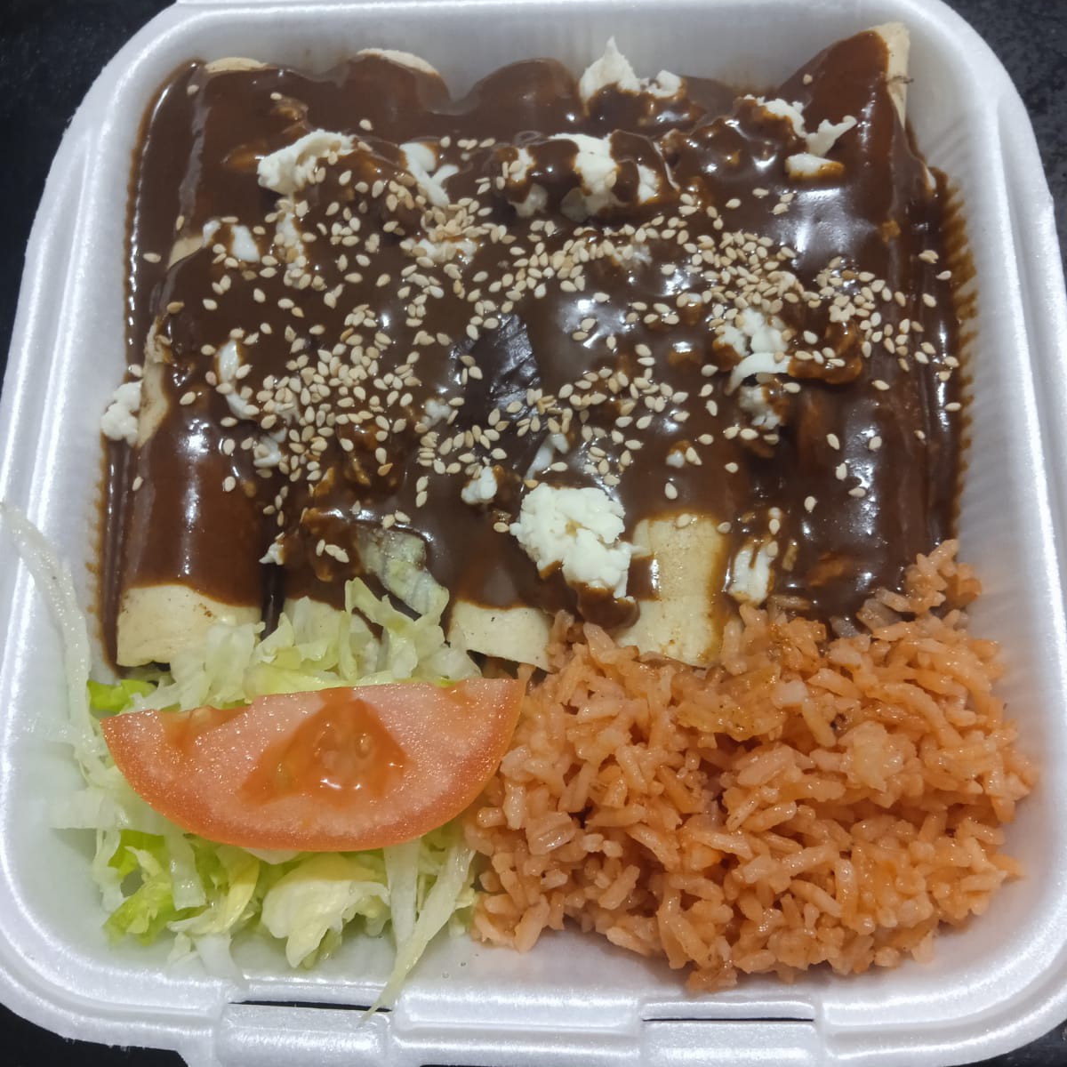 Orden de enmoladas de pierna de puerco bañadas con mole y queso, guarnición disponible y verdura (lechuga y tomate) con 4 piezas