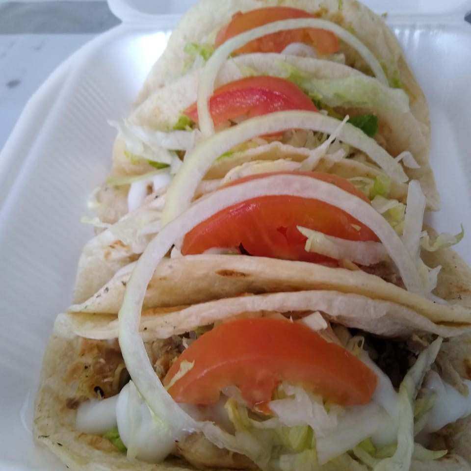 Orden con 4 piezas en tortilla de harina con pierna de puerco, aguacate, crema, lechuga, tomate, cebolla y salsa