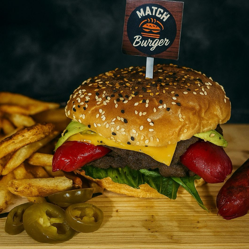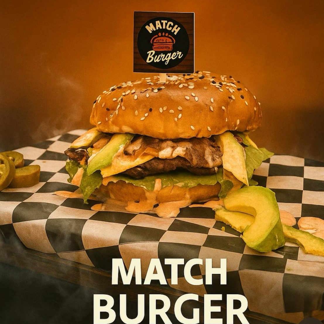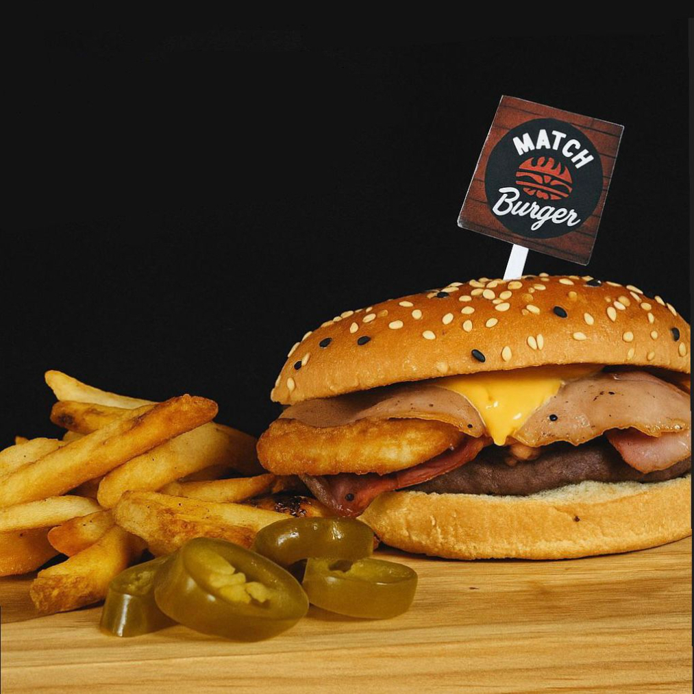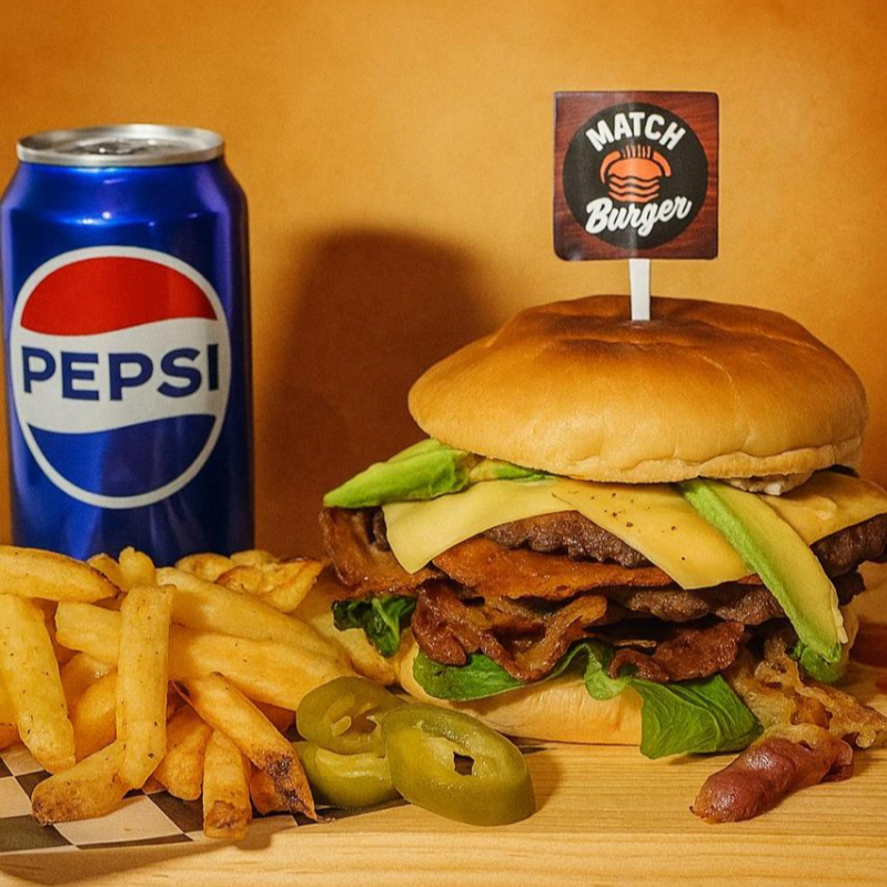 Match burger, 150 gms de papas clásicas, refresco o agua de sabor