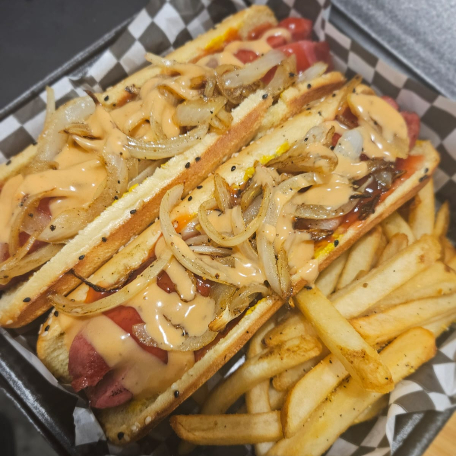 Pan parrillero, salchicha jumbo, tocino, cebolla caramelizada, catsup, mayonesa, mostaza