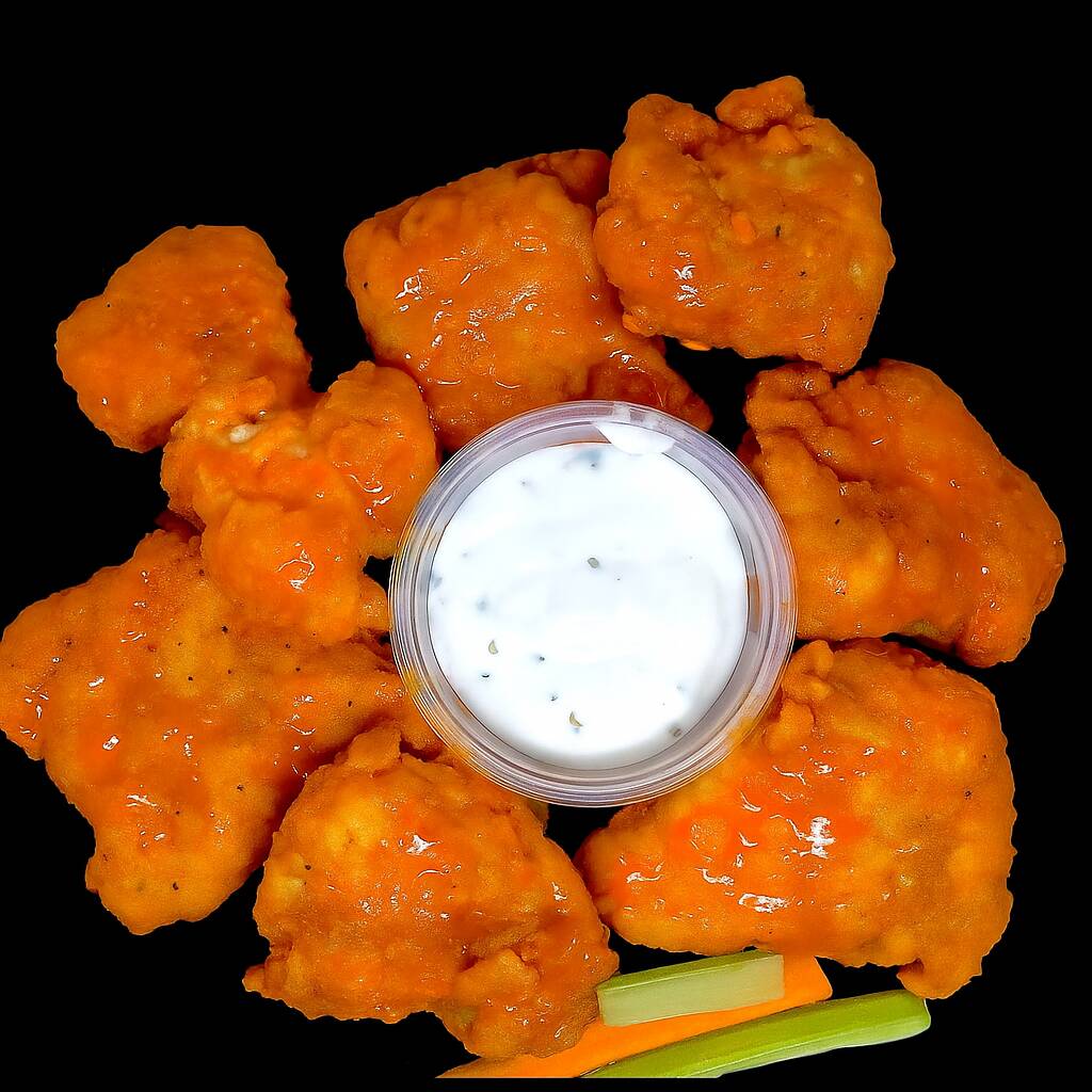 250 gms de trocitos de pollo empanizado (10 piezas aprox) en salsa de tu elección, acompañado de verdura y aderezo ranch