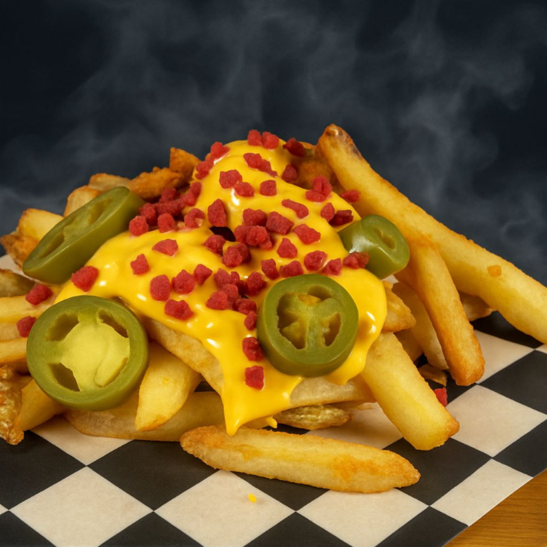 250 gms de papas fritas con pimienta limón, bañadas con queso y tocino deshidratado