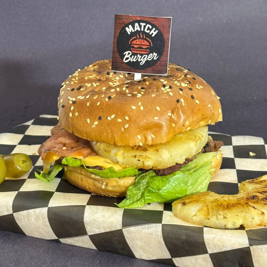 Doble Carne, pan parrillero, jamón, aderezo Match, aguacate, lechuga, mostaza, catsup, mayonesa