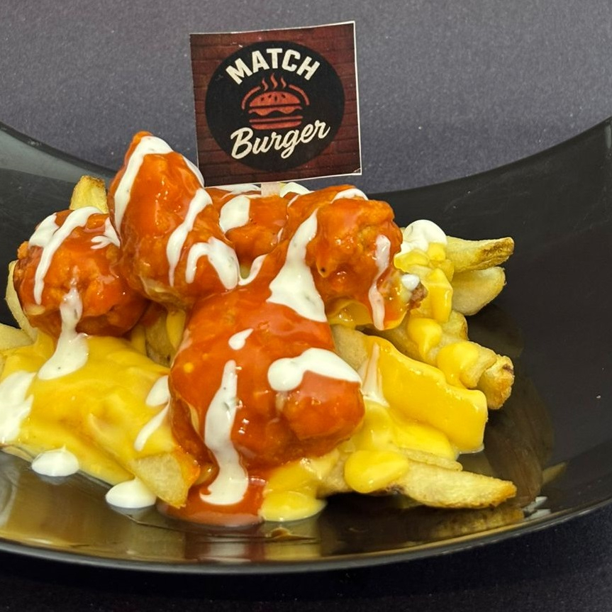 150 gms de trocitos de pollo empanizado en salsa de tu elección sobre una orden de de papas fritas, con pimienta limón, bañadas en queso