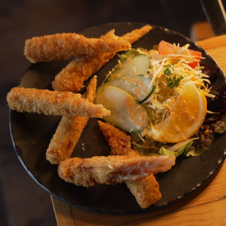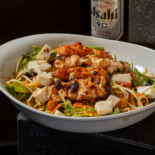 Lechugas mixtas, tomate cherry, cebolla, tofu, zanahoriay acompañada de pollo yakitori con aderezo de ajonjolí.